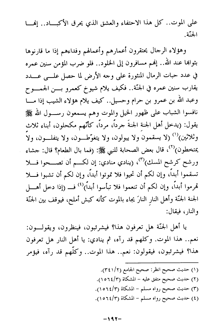 يا أهل الجنّة هل تعرفون هذا؟ فيشرئبون، فينظرون، ويقولون: نعم .. هذا الموت. وكلهم قد رآه، ثم ينادي: يا أهل النار هل تعرفون هذا؟ فيشرئبون، فيقولون: نعم .. هذا الموت .. وكلّهم قد رآه، فيؤمر