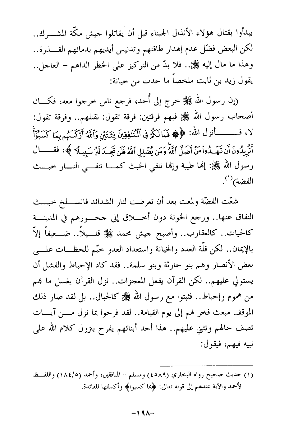 (إن رسول الله - صلى الله عليه وسلم - خرج إلى أُحد، فرجع ناس خرجوا معه، فكان أصحاب رسول الله - صلى الله عليه وسلم - فيهم فرقتين: فرقة تقول: نقتلهم .. وفرقة تقول: لا، فأنزل الله: {فَمَا لَكُمْ في الْمُنَافِقِينَ فِئَتَيْنِ وَاللهُ أَرْكَسَهُمْ بِمَا كَسَبُوا أَتُرِيدُونَ أَنْ تَهْدُوا مَنْ أَضَلَّ الله وَمَنْ يُضْلِلِ الله فَلَنْ تَجِدَ لَهُ سَبِيلًا} فقال رسول الله - صلى الله عليه وسلم -: إنها طيبة وإنها تنفي الخبث كما تنفي النار خبث الفضة) (¬1).