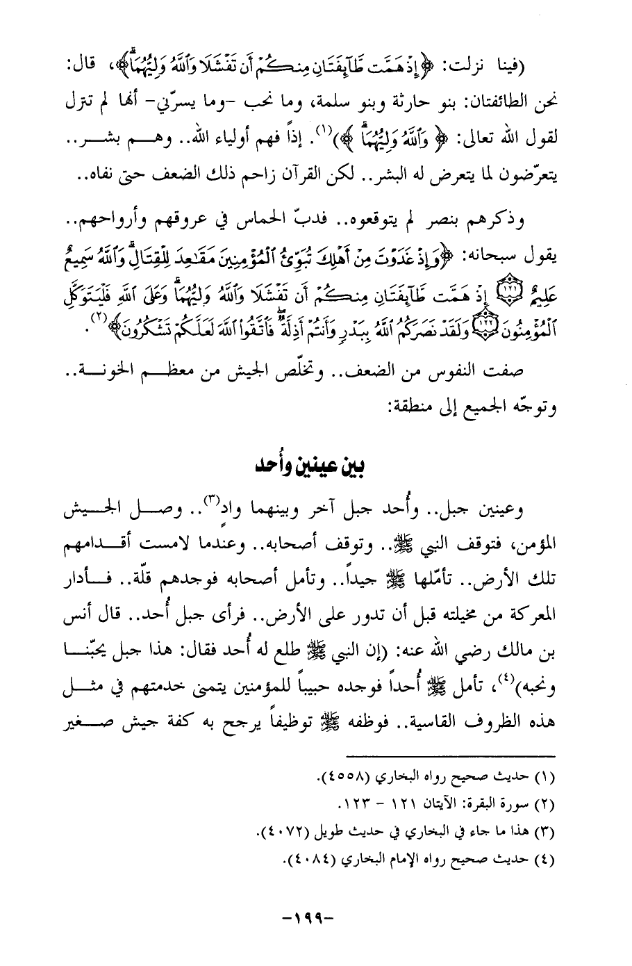 وعينين جبل .. وأُحد جبل آخر وبينهما وادٍ (¬3) .. وصل الجيش المؤمن، فتوقف النبي - صلى الله عليه وسلم - .. وتوقف أصحابه .. وعندما لامست أقدامهم تلك الأرض .. تأمّلها - صلى الله عليه وسلم - جيدًا .. وتأمل أصحابه فوجدهم قلّة .. فأدار المعركة من مخيلته قبل أن تدور على الأرض .. فرأى جبل أُحد .. قال أنس بن مالك رضي الله عنه: (إن النبي - صلى الله عليه وسلم - طلع له أُحد فقال: هذا جبل يحبّنا ونحبه) (¬4)، تأمل - صلى الله عليه وسلم - أُحدًا فوجده حبيبًا للمؤمنين يتمنى خدمتهم في مثل هذه الظروف القاسية .. فوظفه - صلى الله عليه وسلم - توظيفًا يرجح به كفة جيش صغير