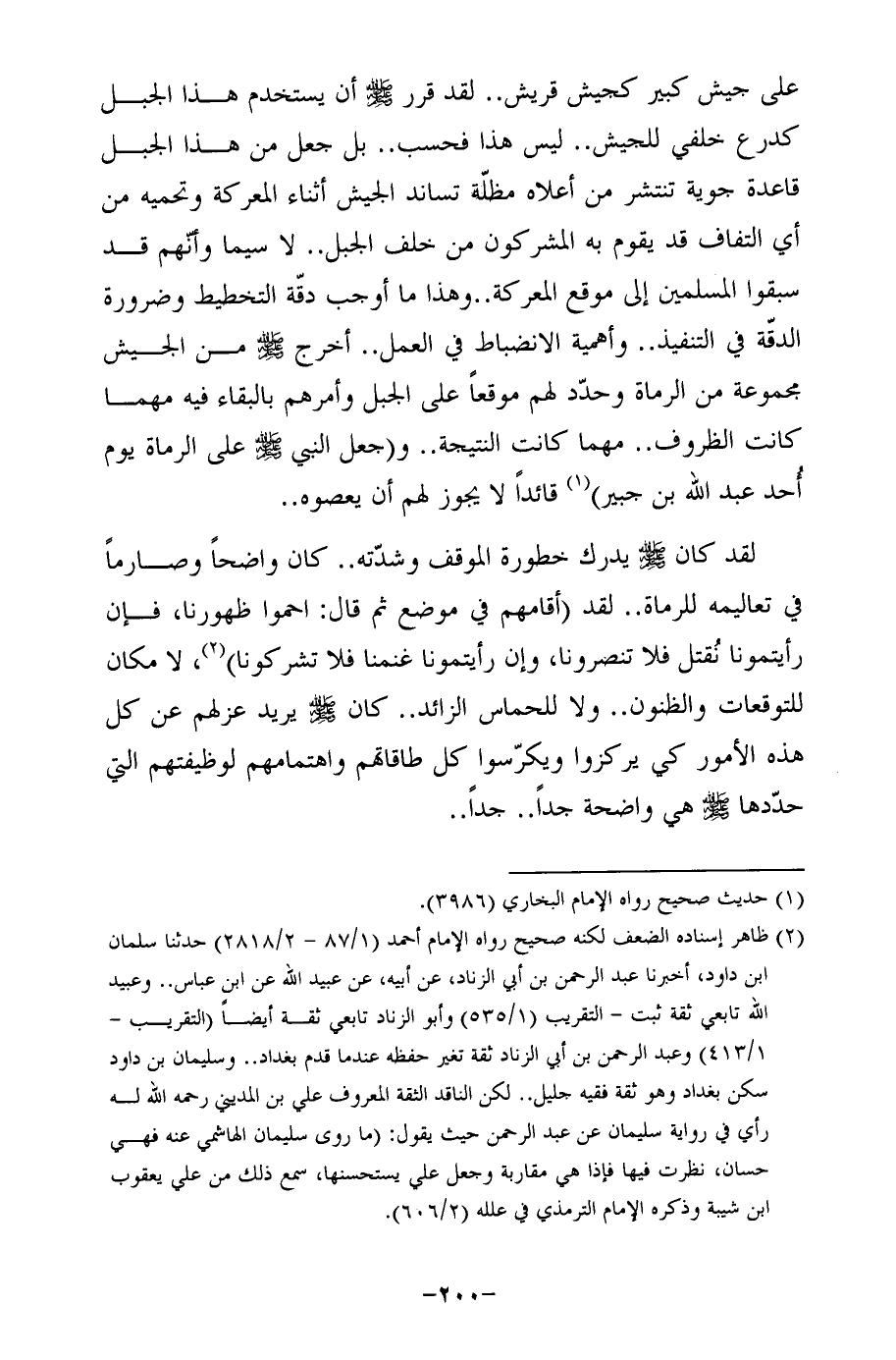 على جيش كبير كجيش قريش .. لقد قرر - صلى الله عليه وسلم - أن يستخدم هذا الجبل كدرع خلفي للجيش .. ليس هذا فحسب .. بل جعل من هذا الجبل قاعدة جوية تنتشر من أعلاه مظلّة تساند الجيش أثناء المعركة وتحميه من أي التفاف قد يقوم به المشركون من خلف الجبل .. لا سيما وأنّهم قد سبقوا المسلمين إلى موقع المعركة .. وهذا ما أوجب دقّة التخطيط وضرورة الدقّة في التنفيذ .. وأهمية الانضباط في العمل .. أخرج - صلى الله عليه وسلم - من الجيش مجموعة من الرماة وحدّد لهم موقعًا على الجبل وأمرهم بالبقاء فيه مهما كانت الظروف .. مهما كانت النتيجة .. و (جعل النبي - صلى الله عليه وسلم - على الرماة يوم أُحد عبد الله بن جبير) (¬1) قائدًا لا يجوز لهم أن يعصوه ..