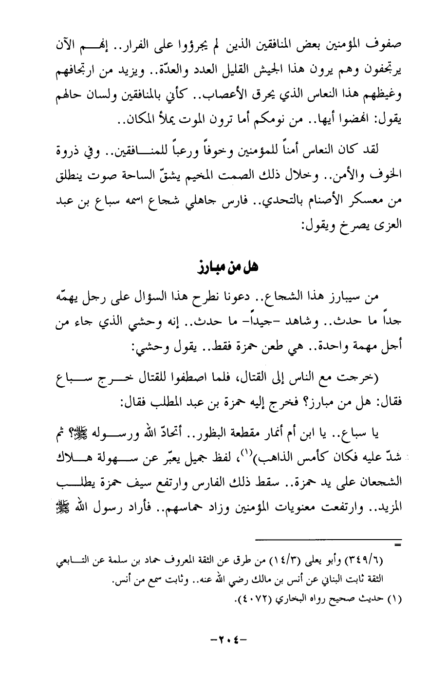 من سيبارز هذا الشجاع .. دعونا نطرح هذا السؤال على رجل يهمّه جدًا ما حدث .. وشاهد -جيدًا- ما حدث .. إنه وحشي الذي جاء من أجل مهمة واحدة .. هي طعن حمزة فقط .. يقول وحشي: