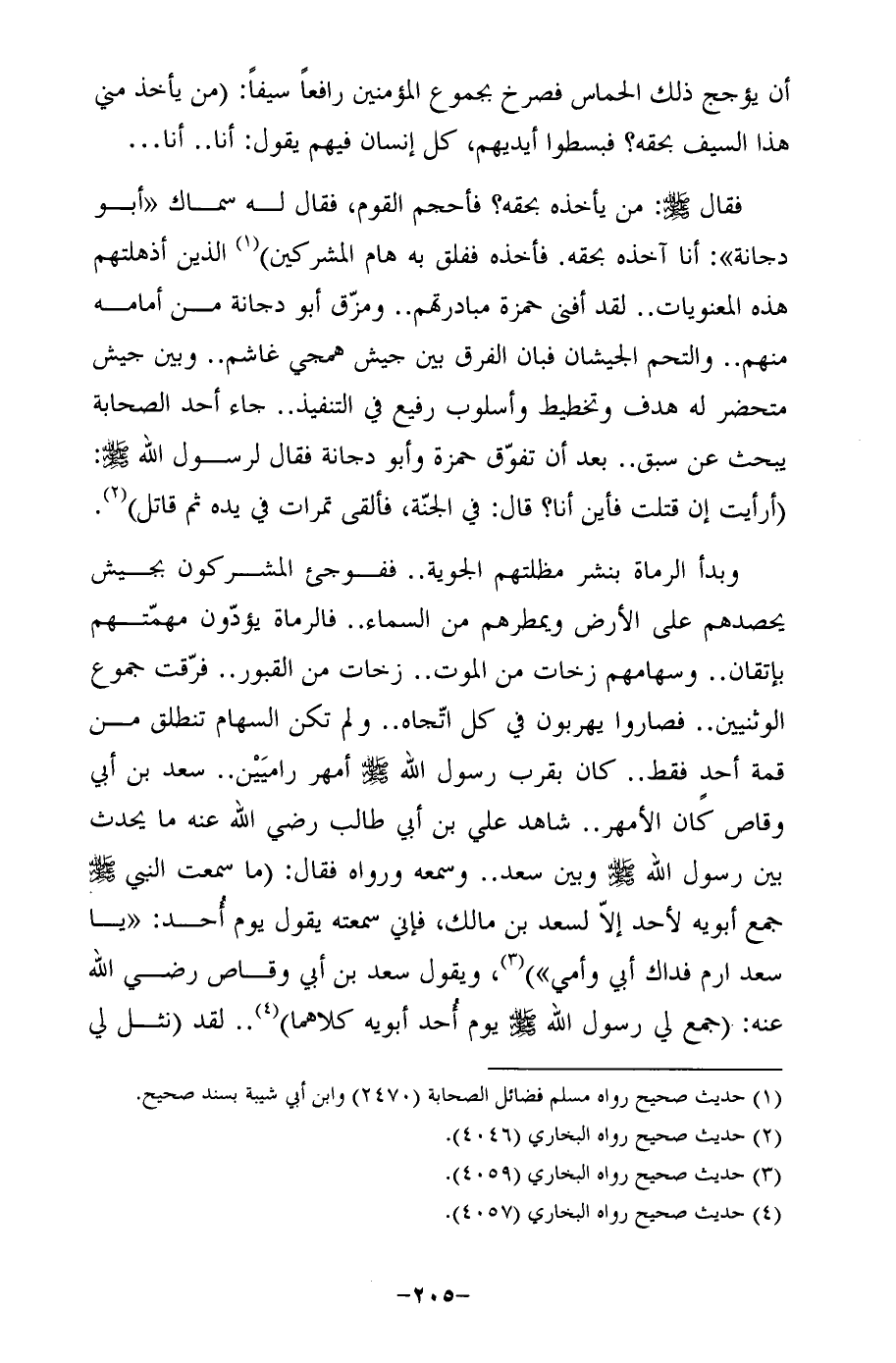 وبدأ الرماة بنشر مظلتهم الجوية .. ففوجئ المشركون بجيش يحصدهم على الأرض ويمطرهم من السماء .. فالرماة يؤدّون مهمّتهم بإتقان .. وسهامهم زخات من الموت .. زخات من القبور .. فرّقت جموع الوثنيين .. فصاروا يهربون في كل اتّجاه .. ولم تكن السهام تنطلق من قمة أحد فقط .. كان بقرب رسول الله - صلى الله عليه وسلم - أمهر راميَيْن .. سعد بن أبي وقاص كان الأمهر .. شاهد علي بن أبي طالب رضي الله عنه ما يحدث بين رسول الله - صلى الله عليه وسلم - وبن سعد .. وسمعه ورواه فقال: (ما سمعت النبي - صلى الله عليه وسلم - جمع أبويه لأحد إلَّا لسعد بن مالك، فإني سمعته يقول يوم أُحد: "يا سعد ارم فداك أبي وأمي") (¬3)، ويقول سعد بن أبي وقاص رضي الله عنه: (جع لي رسول الله - صلى الله عليه وسلم - يوم أُحد أبويه كلاهما) (¬4) .. لقد (نثل لي