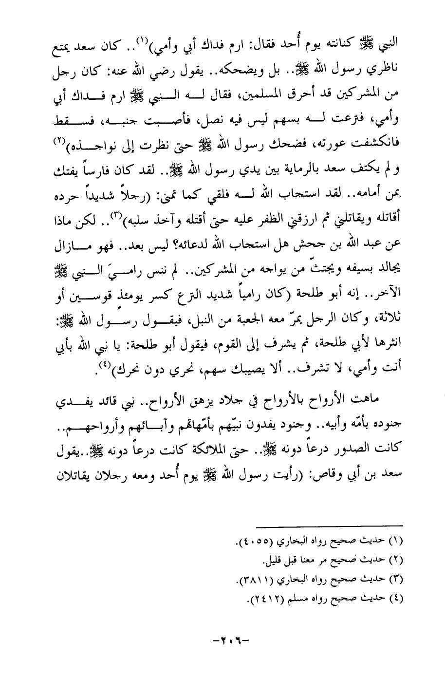 ماهت الأرواح بالأرواح في جلاد يزهق الأرواح .. نبي قائد يفدي جنوده بأمّه وأبيه .. وجنود يفدون نبيّهم بأمّهاتهم وآبائهم وأرواحهم .. كانت الصدور درعًا دونه - صلى الله عليه وسلم - .. حتى الملائكة كانت درعًا دونه - صلى الله عليه وسلم - .. يقول سعد بن أبي وقاص: (رأيت رسول الله - صلى الله عليه وسلم - يوم أحد ومعه رجلان يقاتلان