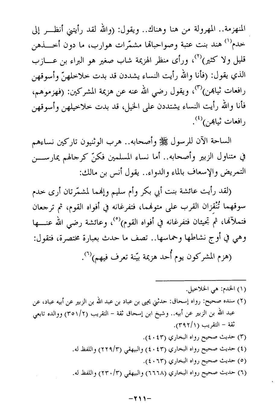 المنهزمة .. المهرولة من هنا وهناك .. ويقول: (والله لقد رأيتني انظر إلى خدم (¬1) هند بنت عتبة وصواحباتها مشمّرات هوارب، ما دون أخذهن قليل ولا كثير) (¬2)، ورأى منظر الهزيمة شاب صغير هو البراء بن عازب الذي يقول: (فأنا والله رأيت النساء يشددن قد بدت خلاخلهنّ وأسوقهن رافعات ثيابهن) (¬3)، ويقول رضي الله عنه عن هزيمه المشركين: (فهزموهم، فأنا والله رأيت النساء يشتددن على الخيل، قد بدت خلاخيلهن وأسوقهن رافعات ثيابهن) (¬4).