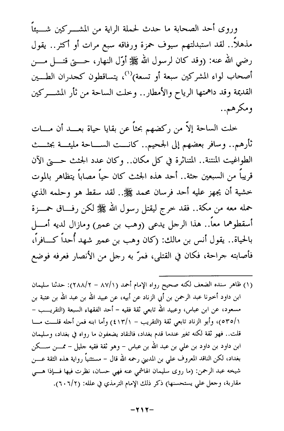 (¬1) ظاهر سنده الضعف لكنه صحيح رواه الإمام أحمد (1/ 87 - 2/ 288): حدثنا سليمان ابن داود أخبرنا عبد الرحمن بن أبي الزناد عن أبيه، عن عبيد الله بن عبد الله بن عتبة بن مسعود، عن ابن عباس، وعبيد الله تابعي ثقة فقيه -أحد الفقهاء السبعة (التقريب- 1/ 535)، وأبو الزناد تابعي ثقة (التقريب-1/ 413) وأما ابنه فمن أجله قلت ما قلت .. فهو ثقة لكنه تغير عندما قدم بغداد، فالنقاد يضعفون ما رواه في بغداد، وسليمان ابن داود بن داود بن علي بن عبد الله بن عباس -وهو ثقة فقيه جليل- ممّن سكن بغداد، لكن الناقد المعروف علي بن المديني رحمه الله قال -مستثنيًا رواية هذه الثقة عن شيخه عبد الرحمن: (ما روى سليمان الهاشمي عنه فهي حسان، نظرت فيها فإذا هي مقاربة، وجعل علي يستحسنها) ذكر ذلك الإمام الترمذيُّ في علله: (2/ 606).