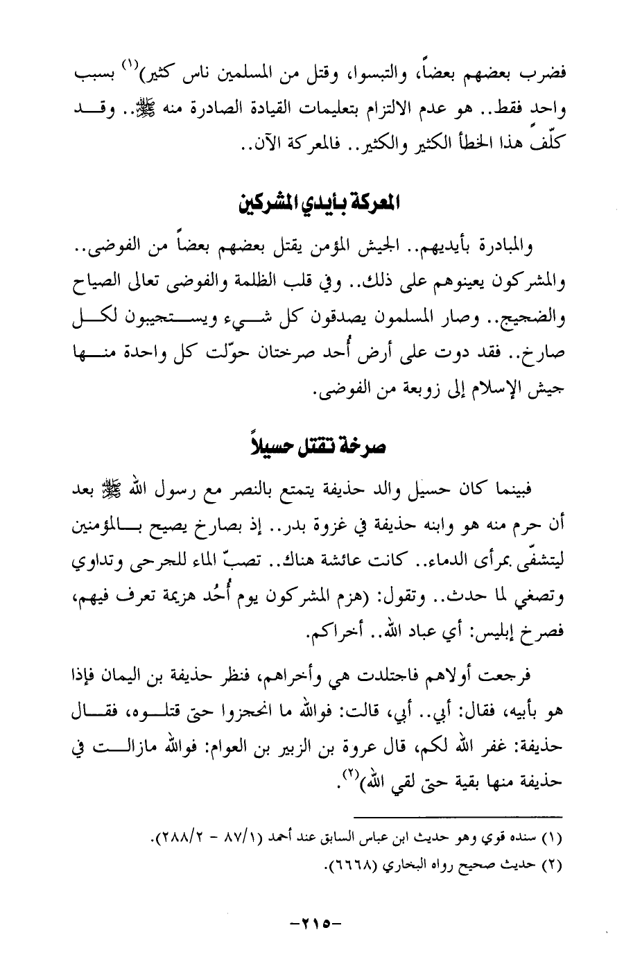 فرجعت أولاهم فاجتلدت هي وأخراهم، فنظر حذيفة بن اليمان فإذا هو بأبيه، فقال: أبي .. أبي، قالت: فوالله ما انحجزوا حتى قتلوه، فقال حذيفة: غفر الله لكم، قال عروة بن الزبير بن العوام: فوالله مازالت في حذيفة منها بقية حتى لقي الله) (¬2).
