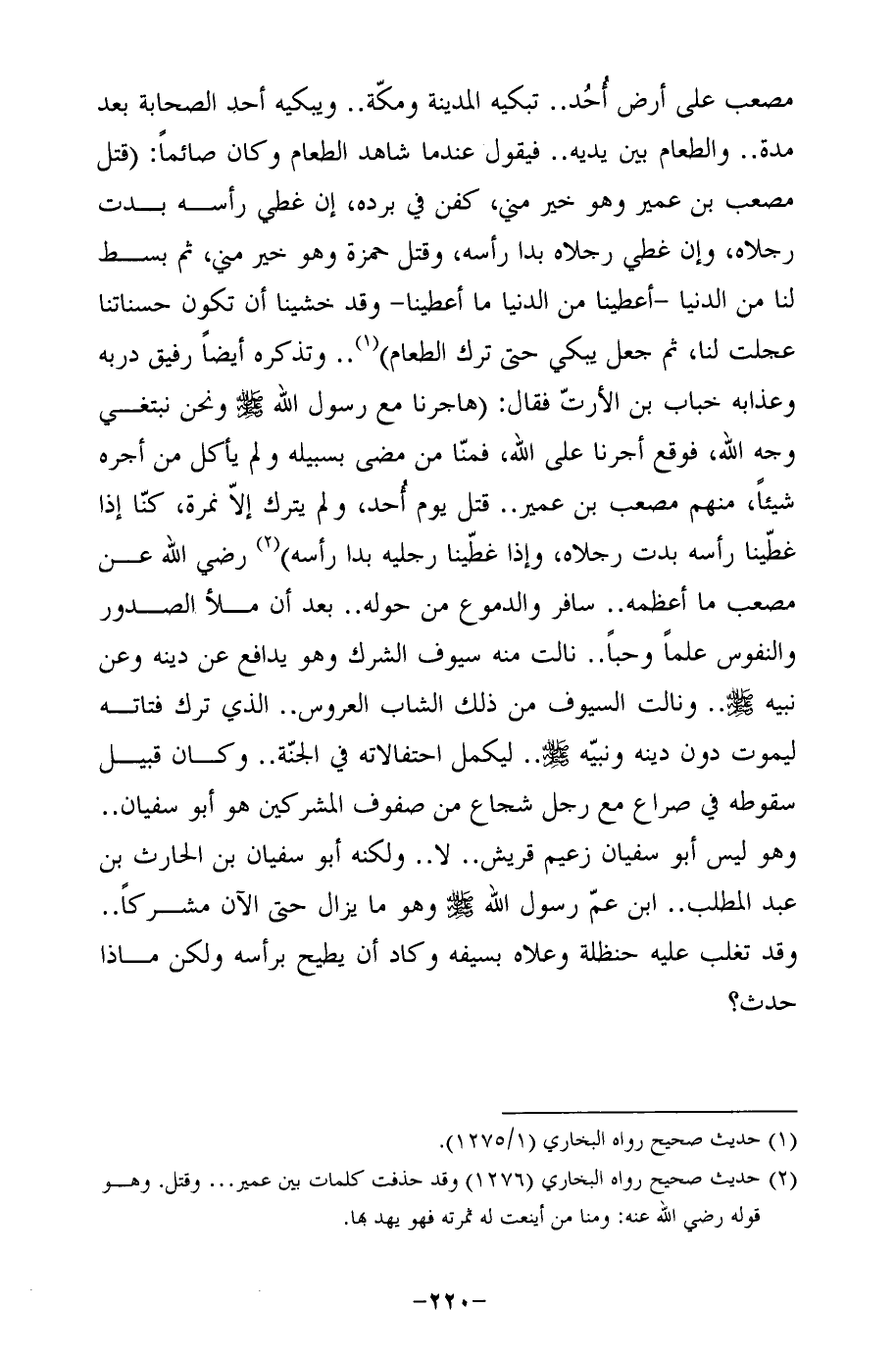 (¬2) حديث صحيح رواه البخاري (1276) وقد حذفت كلمات بين عمير ... وقتل. وهو قوله رضي الله عنه: ومنا من أينعت له ثمرته فهو يهد بها.