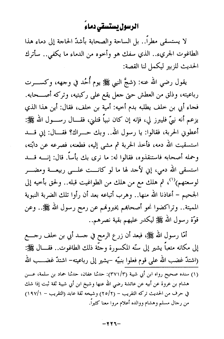 يقول رضي الله عنه: (شجَّ النبي - صلى الله عليه وسلم - يوم أُحُد في وجهه، وكسرت رباعيته، وذلق من العطش حتى جعل يقع على ركبتيه، وتركه أصحابه. فجاء أبي بن خلف يطلبه بدم أخيه: أمية بن خلف، فقال: أين هذا الذي يزعم أنه نبيّ فليبرز لي، فإنه إن كان نبيًا قتلني، فقال رسول الله - صلى الله عليه وسلم -: أعطوني الحربة، فقالوا: يا رسول الله .. وبك حراك؟ فقال: إني قد استسقيت الله دمه، فأخذ الحربة ثم مشى إليه، فطعنه، فصرعه عن دابّته، وحمله أصحابه فاستنقذوه، فقالوا له: ما نرى بك بأسًا. قال: إنه قد استسقى الله دمي، إني لأجد لها ما لو كانت على ربيعة ومضر لوسعتهم) (¬1)، ثم هلك مع من هلك من الطواغيت قبله .. ولحق بأخيه إلى الجحيم- أعاذنا الله منها .. وهرب أتباعه بعد أن رأوا تلك الضربة النبوية المميتة .. وتراكضوا نحو أصحابهم يخبرونهم عن رمح رسول الله - صلى الله عليه وسلم - .. وعن قوّة رسول الله - صلى الله عليه وسلم - ليكدر عليهم بقية نصرهم ..