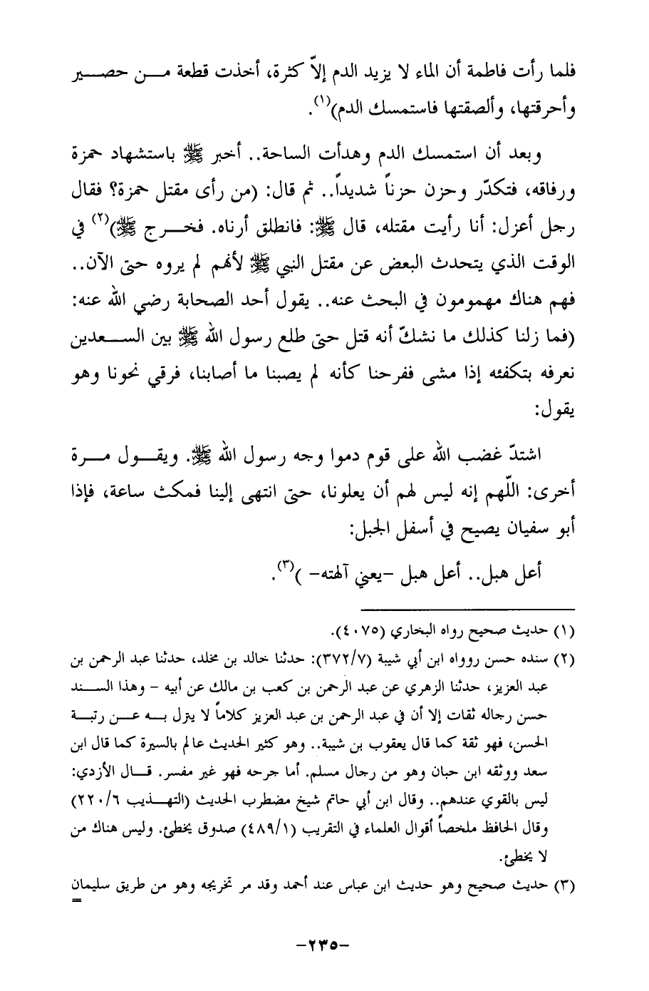 اشتدّ غضب الله على قوم دموا وجه رسول الله - صلى الله عليه وسلم -. ويقول مرة أخرى: اللهم إنه ليس لهم أن يعلونا، حتى انتهى إلينا فمكث ساعة، فإذا أبو سفيان يصيح في أسفل الجبل: