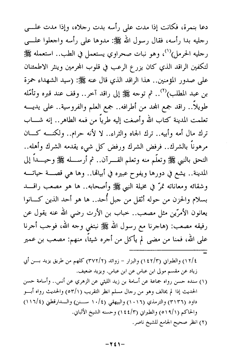 دعا بنمرة، فكانت إذا مدت على رأسه بدت رجلاه، وإذا مدت على رجليه بدا رأسه، فقال رسول الله - صلى الله عليه وسلم -: مدوها على رأسه واجعلوا على رجليه الحرمل) (¬1)، وهو نبات صحراوي يستعمل في الطب .. استعمله - صلى الله عليه وسلم - لتكفين الراقد الذي كان يزرع الرعب في قلوب المجرمين وينثر الاطمئنان على صدور المومنين .. هذا الراقد الذي قال عنه - صلى الله عليه وسلم -: (سيد الشهداء حمزة بن عبد المطلب) (¬2) .. ثم توجه - صلى الله عليه وسلم - إلى راقد آخر .. وقف عند قبره وتأمّله طويلًا .. راقد جمع المجد من أطرافه .. جمع العلم والفروسية .. على يديه تعلمت المدينة كتاب الله وأصغت إليه طريًا من فمه الطاهر .. إنه شاب ترك مال أمه وأبيه .. ترك الجاه والثراء .. لا لأنه حرام .. ولكنه كان مرهونًا بالشرك .. فرفض الشرك ورفض كل شيء يقدمه الشرك وأهله .. التحق بالنبي - صلى الله عليه وسلم - وتعلّم منه وتعلم القرآن .. ثم أرسله - صلى الله عليه وسلم - وحيدًا إلى المدينة .. يشع في دورها ويفوح عبيره في أبياتها .. وها هي قصة حياته وشقائه ومعاناته تمرّ في مخيلة النبي - صلى الله عليه وسلم - وأصحابه .. ها هو مصعب راقد بسلام والحزن من حوله أثقل من جبل أحد .. ها هو أحد الذين كانوا يعانون الأمرّين مثل مصعب .. خباب بن الأرت رضي الله عنه يقول عن رفيقه مصعب: (هاجرنا مع رسول الله - صلى الله عليه وسلم - نبتغي وجه الله، فوجب أجرنا على الله، فمنا من مضى لم يأكل من أجره شيئًا، منهم: مصعب بن عمير