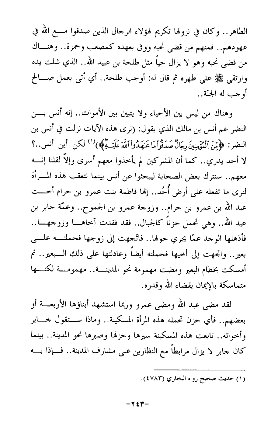 وهناك من ليس بين الأحياء ولا يتبين بين الأموات .. إنه أنس بن النضر عم أنس بن مالك الذي يقول: (نرى هذه الآيات نزلت في أنس بن النضر: {مِنَ الْمُؤْمِنِينَ رِجَالٌ صَدَقُوا مَا عَاهَدُوا اللَّهَ عَلَيْهِ}) (¬1) لكن أين أنس .. ؟ لا أحد يدري .. كما أن المشركين لم يأخذوا معهم أسرى وإلاّ لقلنا إنه معهم .. سنترك بعض الصحابة ليبحثوا عن أنس بينما نتعقب هذه المرأة لنرى ما تفعله على أرض أُحُد .. إنها فاطمة بنت عمرو بن حرام أخت عبد الله بن عمرو بن حرام .. وزوجة عمرو بن الجموح .. وعمّة جابر بن عبد الله .. وهي تحمل حزنًا كالجبال .. فقد فقدت آخاها وزوجها .. فأذهلها الوجد عمّا يجري حولها .. فاتّجهت إلى زوجها فحملته على بعير .. واتجهت إلى أخيها فحملته أيضًا وعادلتها على ذلك البعير .. ثم أمسكت بخطام البعير ومضت مهمومة نحو المدينة .. مهمومة لكنها متماسكة بالإيمان بقضاء الله وقدره.