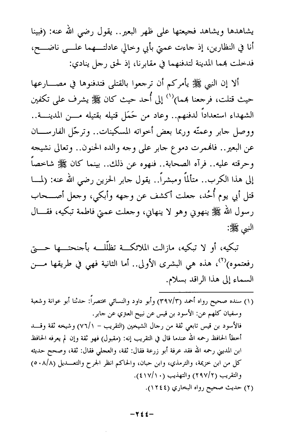 ألا إن النبي - صلى الله عليه وسلم - يأمركم أن ترجعوا بالقتلى فتدفنوها في مصارعها حيث قتلت، فرجعنا بهما) (¬1) إلى أُحد حيث كان - صلى الله عليه وسلم - يشرف على تكفين الشهداء استعدادًا لدفنهم .. وعاد من حَمَل قتيله بقتيله من المدينة .. ووصل جابر وعمتّه وربما بعض أخواته المسكينات .. وترجّل الفارسان عن البعير .. فانهمرت دموع جابر على وجه والده الحنون .. وتعالى نشيجه وحرقته عليه .. فرآه الصحابة .. فنهوه عن ذلك .. بينما كان - صلى الله عليه وسلم - شاخصًا إلى هذا الكرب .. متألمًا ومبشرًا .. يقول جابر الحزين رضي الله عنه: (لما قتل أبي يوم أحُد، جعلت أكشف عن وجهه وأبكي، وجعل أصحاب رسول الله - صلى الله عليه وسلم - ينهوني وهو لا ينهاني، وجعلت عمتي فاطمة تبكيه، فقال النبي - صلى الله عليه وسلم -: