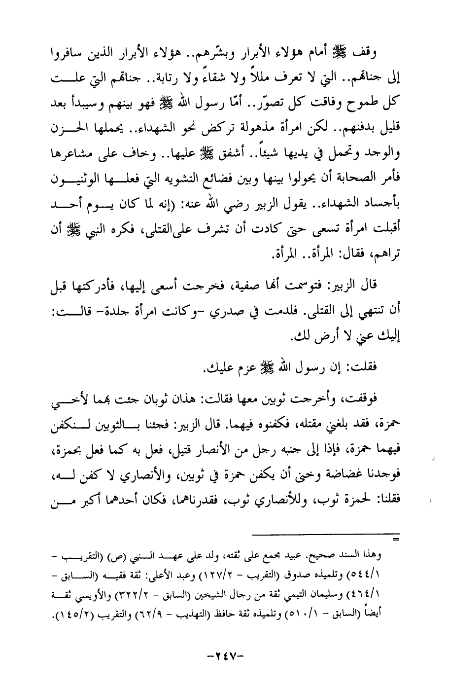 فوقفت، وأخرجت ثوبين معها فقالت: هذان ثوبان جئت بهما لأخي حمزة، فقد بلغني مقتله، فكفنوه فيهما. قال الزبير: فجئنا بالثوبين لنكفن فيهما حمزة، فإذا إلى جنبه رجل من الأنصار قتيل، فعل به كما فعل بحمزة، فوجدنا غضاضة وخنى أن يكفن حمزة في ثوبين، والأنصاري لا كفن له، فقلنا: لحمزة ثوب، وللأنصاري ثوب، فقدرناهما، فكان أحدهما أكبر من