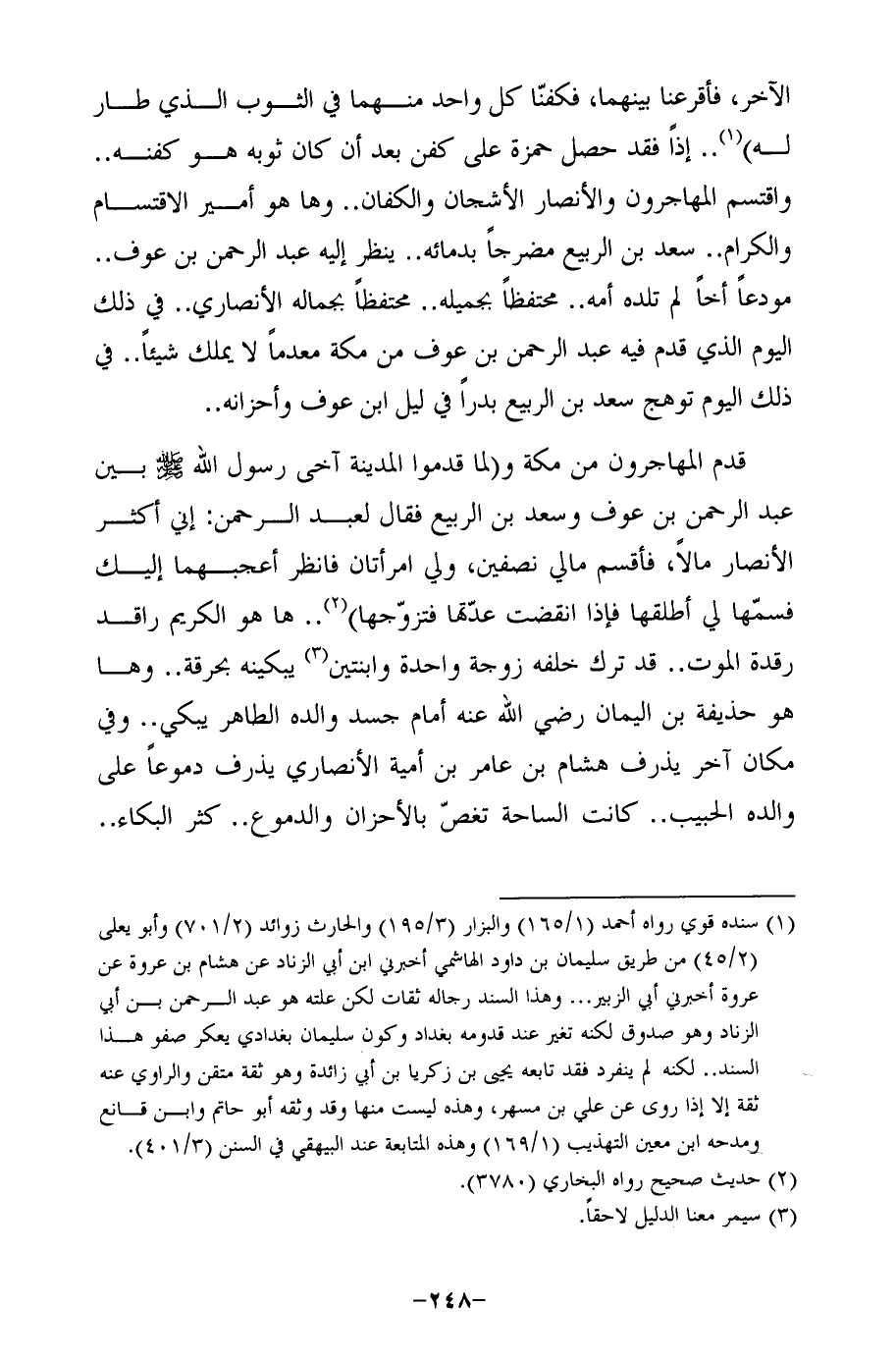 الآخر، فأقرعنا بينهما، فكفنّا كل واحد منهما في الثوب الذي طار له) (¬1) .. إذًا فقد حصل حمزة على كفن بعد أن كان ثوبه هو كفنه .. واقتسم المهاجرون والأنصار الأشجان والكفان .. وها هو أمير الاقتسام والكرام .. سعد بن الربيع مضرجًا بدمائه .. ينظر إليه عبد الرحمن بن عوف .. مودعًا أخًا لم تلده أمه .. محتفظًا بجميله .. محتفظًا بجماله الأنصاري .. في ذلك اليوم الذي قدم فيه عبد الرحمن بن عوف من مكة معدمًا لا يملك شيئًا .. في ذلك اليوم توهج سعد بن الربيع بدرًا في ليل ابن عوف وأحزانه ..