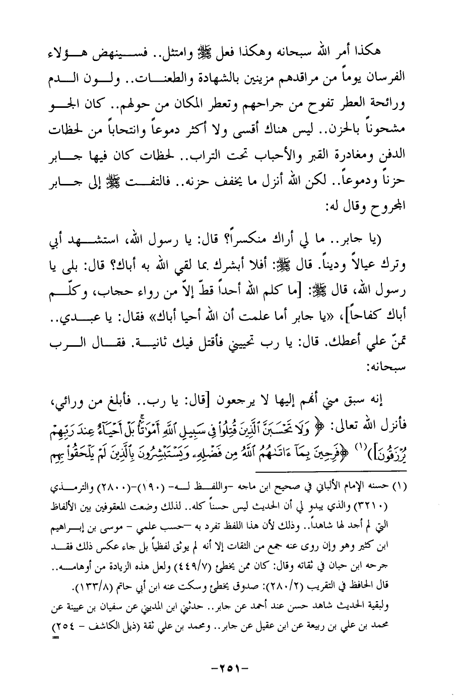 (يا جابر .. ما لي أراك منكسرًا؟ قال: يا رسول الله، استشهد أبي وترك عيالًا ودينًا. قال - صلى الله عليه وسلم -: أفلا أبشرك بما لقي الله به أباك؟ قال: بلى يا رسول الله، قال - صلى الله عليه وسلم -: [ما كلم الله أحدا قطّ إلَّا من رواء حجاب، وكلّم أباك كفاحًا]، "يا جابر أما علمت أن الله أحيا أباك" فقال: يا عبدي .. تمنّ علي أعطك. قال: يا رب تحييني فأقتل فيك ثانية. فقال الرب سبحانه:
