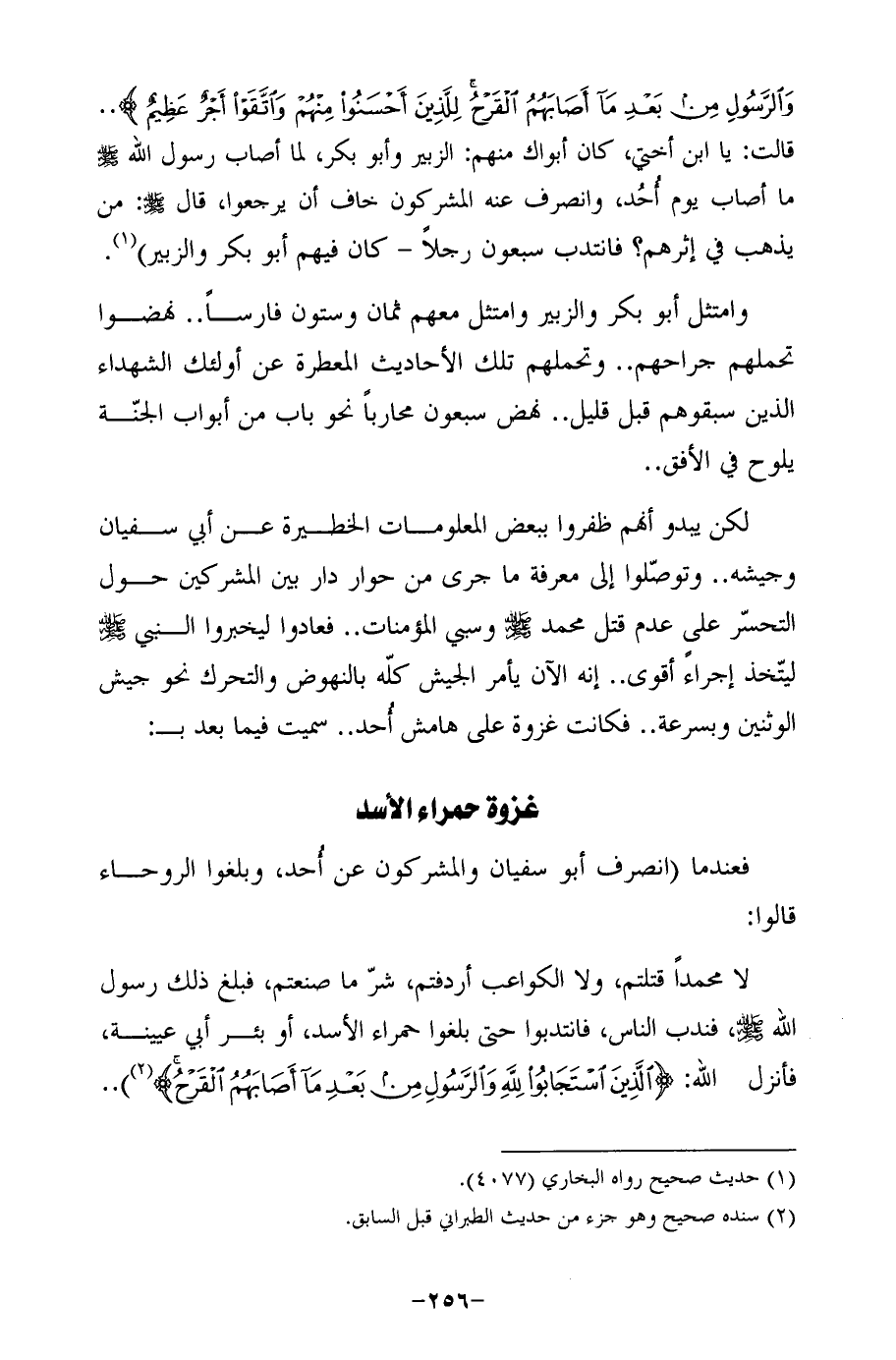 وَالرَّسُولِ مِنْ بَعْدِ مَا أَصَابَهُمُ الْقَرْحُ لِلَّذِينَ أَحْسَنُوا مِنْهُمْ وَاتَّقَوْا أَجْرٌ عَظِيمٌ} .. قالت: يا ابن أختي، كان أبواك منهم: الزبير وأبو بكر، لما أصاب رسول الله - صلى الله عليه وسلم - ما أصاب يوم أُحُد، وانصرف عنه المشركون خاف أن يرجعوا، قال - صلى الله عليه وسلم -: من يذهب في إثرهم؟ فانتدب سبعون رجلًا- كان فيهم أبو بكر والزبير) (¬1).
