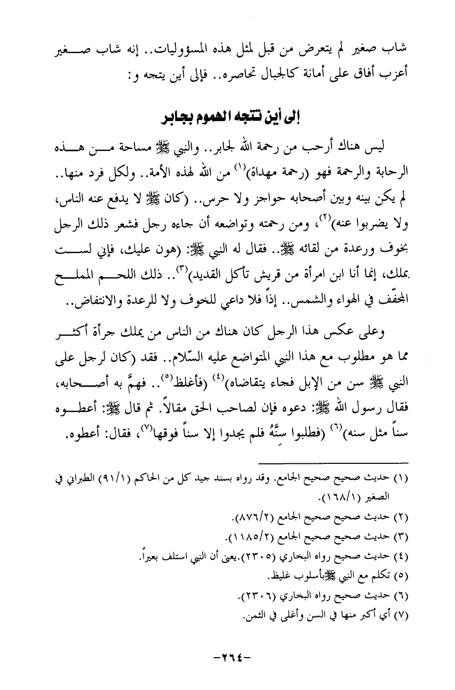 ليس هناك أرحب من رحمة الله لجابر .. والنبي - صلى الله عليه وسلم - مساحة من هذه الرحابة والرحمة فهو (رحمة مهداة) (¬1) من الله لهذه الأمة .. ولكل فرد منها .. لم يكن بينه وبن أصحابه حواجز ولا حرس .. (كان - صلى الله عليه وسلم - لا يدفع عنه الناس، ولا يضربوا عنه) (¬2)، ومن رحمته وتواضعه أن جاءه رجل فشعر ذلك الرجل بخوف ورعدة من لقائه - صلى الله عليه وسلم - .. فقال له النبي - صلى الله عليه وسلم -: (هون عليك، فإني لست بملك، إنما أنا ابن امرأة من قريش تأكل القديد) (¬3) .. ذلك اللحم المملح المجفّف في الهواء والشمس .. إذًا فلا داعي للخوف ولا للرعدة والانتفاض ..