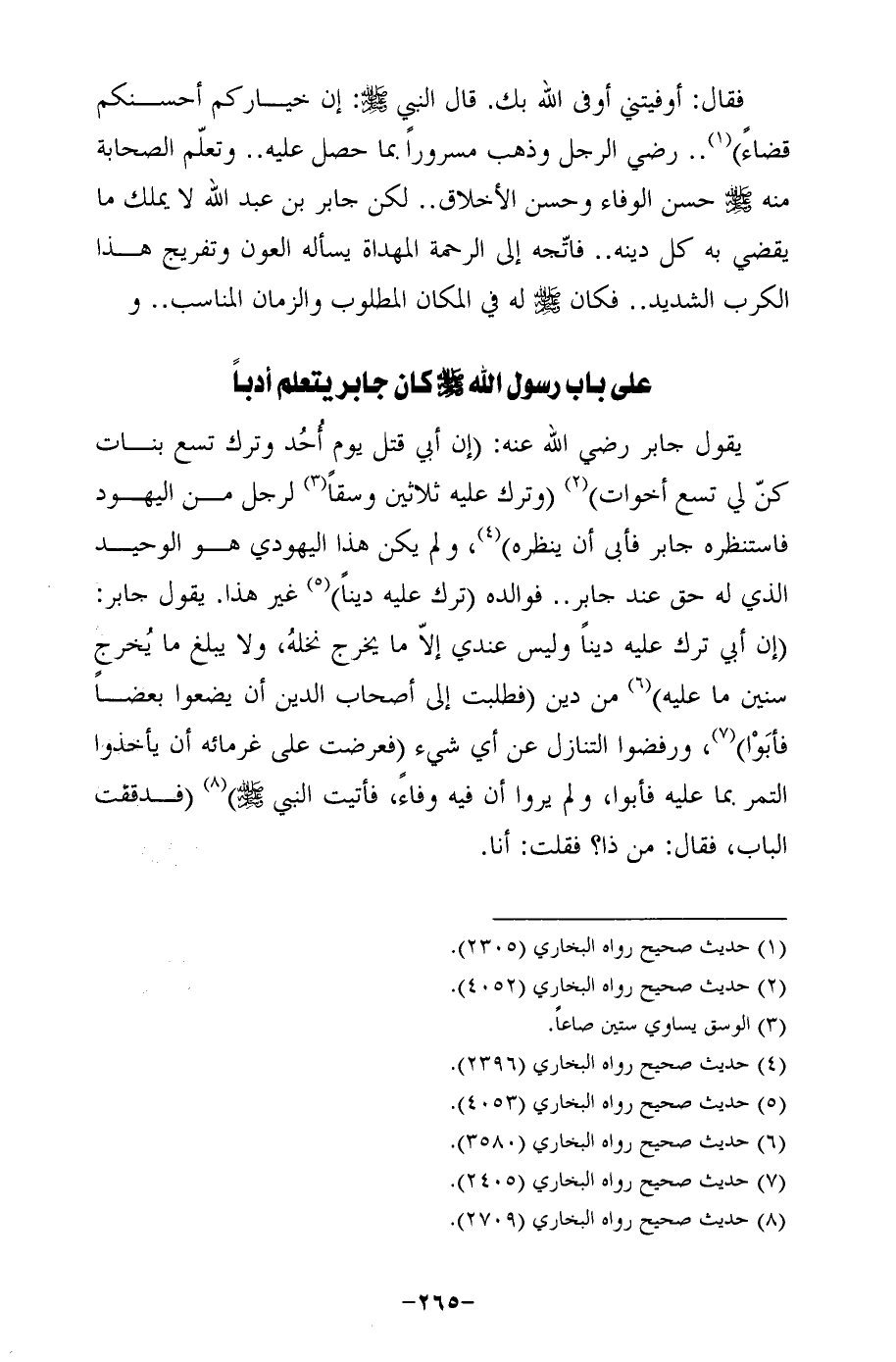 فقال: أوفيتني أوفى الله بك. قال النبي - صلى الله عليه وسلم -: إن خياركم أحسنكم قضاءً) (¬1) .. رضي الرجل وذهب مسرورًا بما حصل عليه .. وتعلّم الصحابة منه - صلى الله عليه وسلم - حسن الوفاء وحسن الأخلاق .. لكن جابر بن عبد الله لا يملك ما يقضي به كل دينه .. فاتّجه إلى الرحمة المهداة يسأله العون وتفريج هذا الكرب الشديد .. فكان - صلى الله عليه وسلم - له في المكان المطلوب والزمان المناسب ..