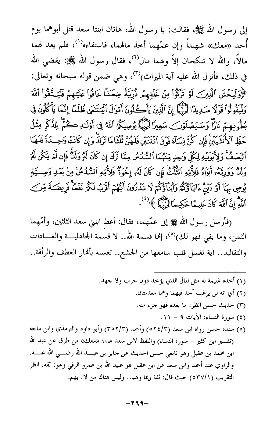 إلى رسول الله - صلى الله عليه وسلم -، فقالت: يا رسول الله، هاتان ابنتا سعد قتل أبوهما يوم أُحد "معك" شهيدًا وإن عمّهما أخذ مالهما، فاستفاءه (¬1)، فلم يعد لهما مالًا، والله لا تنكحان إلَّا ولهما مال (¬2)، فقال رسول الله - صلى الله عليه وسلم -: يقض الله في ذلك، فأنزل الله عليه آية الميراث) (¬3)، وهي ضمن قوله سبحانه وتعالى: {وَلْيَخْشَ الَّذِينَ لَوْ تَرَكُوا مِنْ خَلْفِهِمْ ذُرِّيَّةً ضِعَافًا خَافُوا عَلَيْهِمْ فَلْيَتَّقُوا اللَّهَ وَلْيَقُولُوا قَوْلًا سَدِيدًا (9) إِنَّ الَّذِينَ يَأْكُلُونَ أَمْوَالَ الْيَتَامَى ظُلْمًا إِنَّمَا يَأْكُلُونَ فِي بُطُونِهِمْ نَارًا وَسَيَصْلَوْنَ سَعِيرًا (10) يُوصِيكُمُ اللَّهُ فِي أَوْلَادِكُمْ لِلذَّكَرِ مِثْلُ حَظِّ الْأُنْثَيَيْنِ فَإِنْ كُنَّ نِسَاءً فَوْقَ اثْنَتَيْنِ فَلَهُنَّ ثُلُثَا مَا تَرَكَ وَإِنْ كَانَتْ وَاحِدَةً فَلَهَا النِّصْفُ وَلِأَبَوَيْهِ لِكُلِّ وَاحِدٍ مِنْهُمَا السُّدُسُ مِمَّا تَرَكَ إِنْ كَانَ لَهُ وَلَدٌ فَإِنْ لَمْ يَكُنْ لَهُ وَلَدٌ وَوَرِثَهُ أَبَوَاهُ فَلِأُمِّهِ الثُّلُثُ فَإِنْ كَانَ لَهُ إِخْوَةٌ فَلِأُمِّهِ السُّدُسُ مِنْ بَعْدِ وَصِيَّةٍ يُوصِي بِهَا أَوْ دَيْنٍ آبَاؤُكُمْ وَأَبْنَاؤُكُمْ لَا تَدْرُونَ أَيُّهُمْ أَقْرَبُ لَكُمْ نَفْعًا فَرِيضَةً مِنَ اللَّهِ إِنَّ اللَّهَ كَانَ عَلِيمًا حَكِيمًا (11)} (¬4).