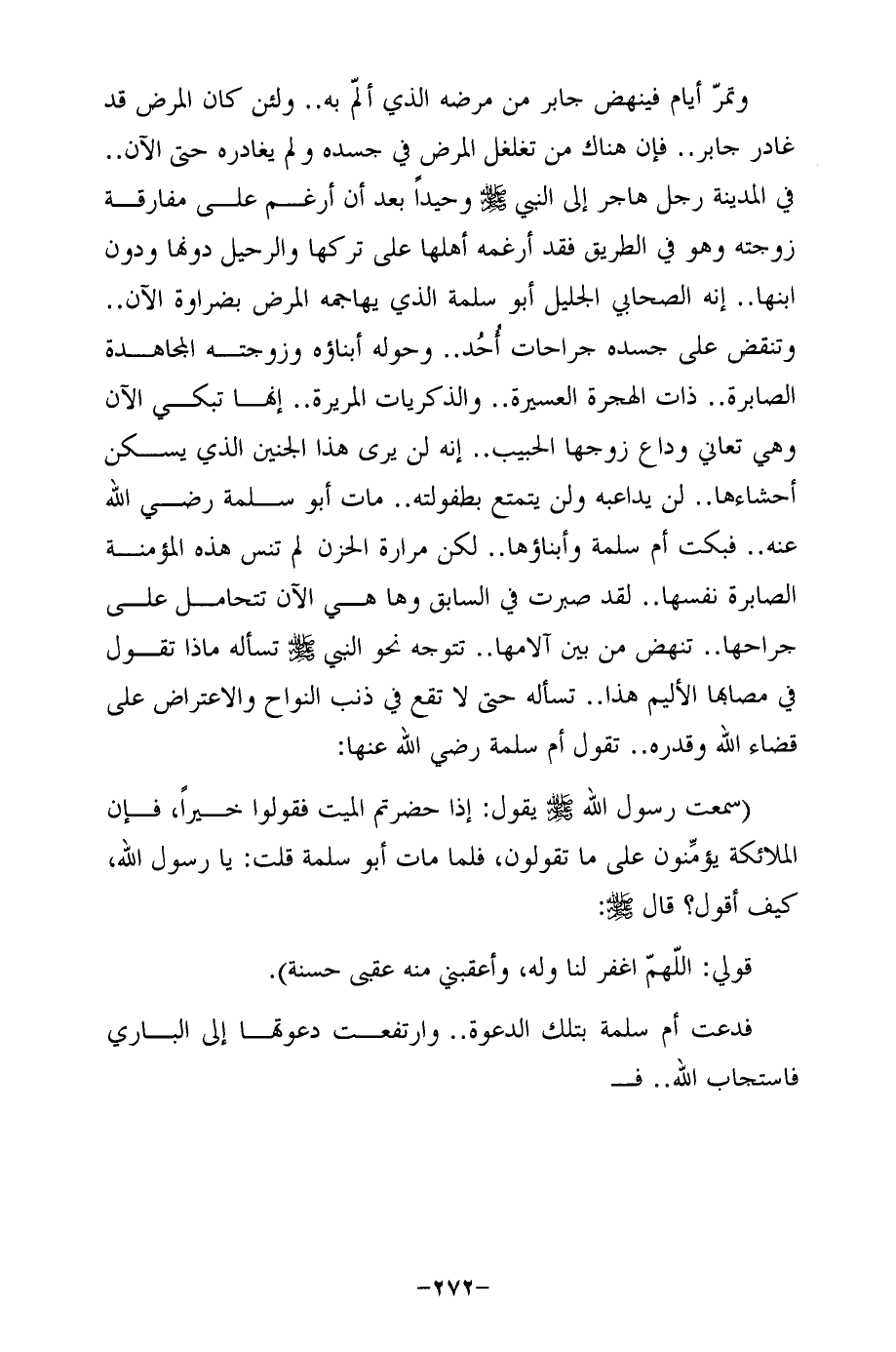 وتمرّ أيام فينهض جابر من مرضه الذي ألمّ به .. ولئن كان المرض قد غادر جابر .. فإن هناك من تغلغل المرض في جسده ولم يغادره حتى الآن .. في المدينة رجل هاجر إلى النبي - صلى الله عليه وسلم - وحيدًا بعد أن أرغم على مفارقة زوجته وهو في الطريق فقد أرغمه أهلها على تركها والرحيل دونها ودون ابنها .. إنه الصحابي الجليل أبو سلمة الذي يهاجمه المرض بضراوة الآن .. وتنقض على جسده جراحات أحُد .. وحوله أبناؤه وزوجته المجاهدة الصابرة .. ذات الهجرة العسيرة .. والذكريات المريرة .. إنها تبكي الآن وهي تعاني وداع زوجها الحبيب .. إنه لن يرى هذا الجنين الذي يسكن أحشاءها .. لن يداعبه ولن يتمتع بطفولته .. مات أبو سلمة رضي الله عنه .. فبكت أم سلمة وأبناؤها .. لكن مرارة الحزن لم تنس هذه المؤمنة الصابرة نفسها .. لقد صبرت في السابق وها هي الآن تتحامل على جراحها .. تنهض من بين آلامها .. تتوجه نحو النبي - صلى الله عليه وسلم - تسأله ماذا تقول في مصابها الأليم هذا .. تسأله حتى لا تقع في ذنب النواح والاعتراض على قضاء الله وقدره .. تقول أم سلمة رضي الله عنها: