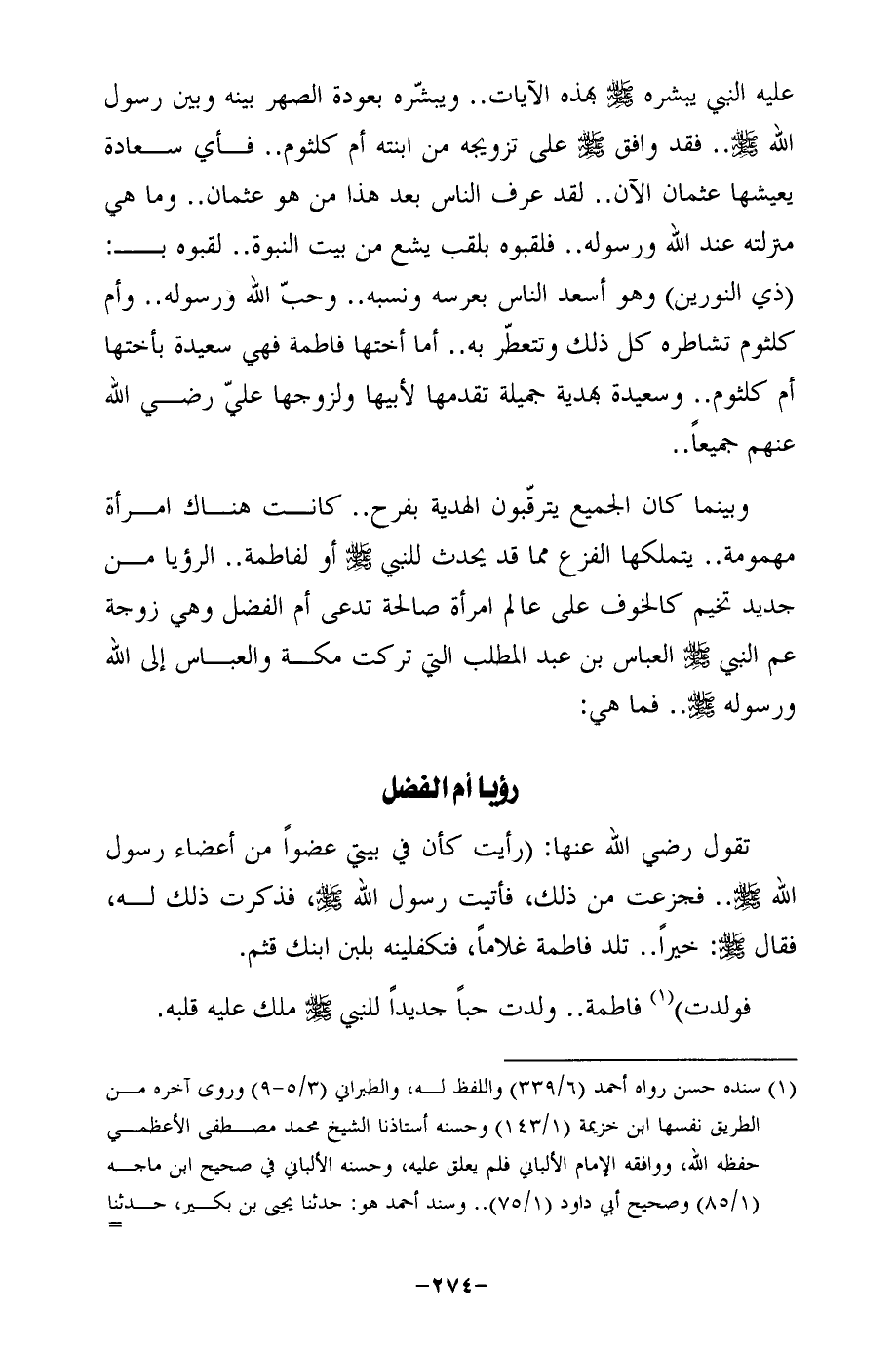 وبينما كان الجميع يترقّبون الهدية بفرح .. كانت هناك امرأة مهمومة .. يتملكها الفزع مما قد يحدث للنبي - صلى الله عليه وسلم - أو لفاطمة .. الرؤيا من جديد تخيم كالخوف على عالم امرأة صالحة تدعى أم الفضل وهي زوجة عم النبي - صلى الله عليه وسلم - العباس بن عبد المطلب التي تركت مكة والعباس إلى الله ورسوله - صلى الله عليه وسلم - .. فما هي: