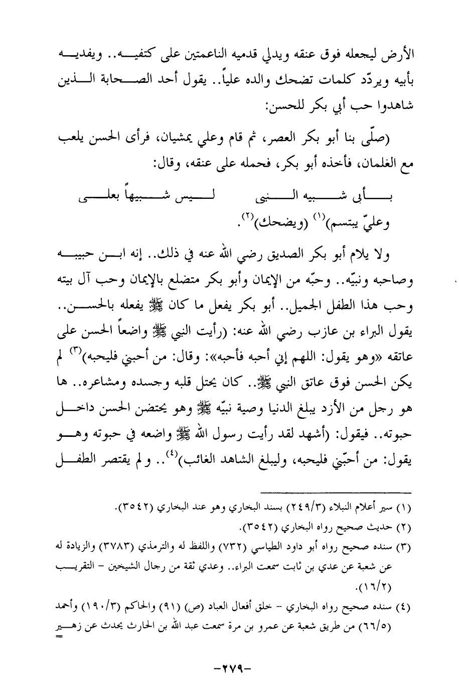 ولا يلام أبو بكر الصديق رضي الله عنه في ذلك .. إنه ابن حبيبه وصاحبه ونبيّه .. وحبّه من الإيمان وأبو بكر متضلع بالإيمان وحب آل بيته وحب هذا الطفل الجميل .. أبو بكر يفعل ما كان - صلى الله عليه وسلم - يفعله بالحسن .. يقول البراء بن عازب رضي الله عنه: (رأيت النبي - صلى الله عليه وسلم - واضعًا الحسن على عاتقه "وهو يقول: اللَّهم إني أحبه فأحبه": وقال: من أحبني فليحبه) (¬3) لم يكن الحسن فوق عاتق النبي - صلى الله عليه وسلم - .. كان يحتل قلبه وجسده ومشاعره .. ها هو رجل من الأزد يبلغ الدنيا وصية نبيّه - صلى الله عليه وسلم - وهو يحتضن الحسن داخل حبوته .. فيقول: (أشهد لقد رأيت رسول الله - صلى الله عليه وسلم - واضعه في حبوته وهو يقول: من أحبّني فليحبه، وليبلغ الشاهد الغائب) (¬4) .. ولم يقتصر الطفل
