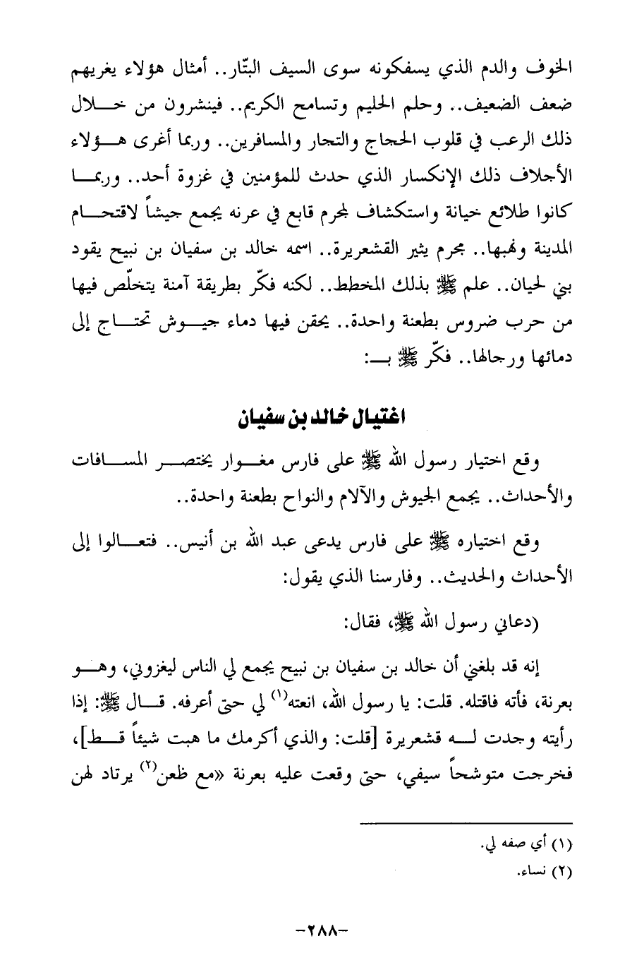 الخوف والدم الذي يسفكونه سوى السيف البتّار .. أمثال هؤلاء يغريهم ضعف الضعيف .. وحلم الحليم وتسامح الكريم .. فينشرون من خلال ذلك الرعب في قلوب الحجاج والتجار والمسافرين .. وربما أغرى هؤلاء الأجلاف ذلك الإنكسار الذي حدث للمؤمنين في غزوة أحد .. وربما كانوا طلائع خيانة واستكشاف لمجرم قابع في عرنه يجمع جيشًا لاقتحام المدينة ونهبها .. مجرم يثير القشعريرة .. اسمه خالد بن سفيان بن نبيح يقود بني لحيان .. علم - صلى الله عليه وسلم - بذلك المخطط .. لكنه فكّر بطريقة آمنة يتخلّص فيها من حرب ضروس بطعنة واحدة .. يحقن فيها دماء جيوش تحتاج إلى دمائها ورجالها .. فكّر - صلى الله عليه وسلم - بـ: