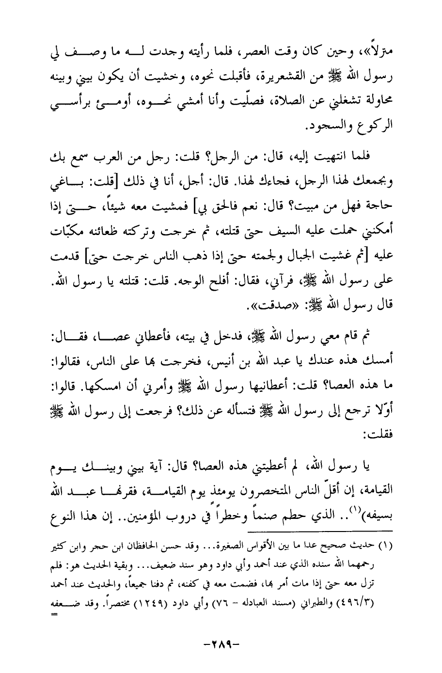 ثم قام معي رسول الله - صلى الله عليه وسلم -، فدخل في بيته، فأعطاني عصا، فقال: أمسك هذه عندك يا عبد الله بن أنيس، فخرجت بها على الناس، فقالوا: ما هذه العصا؟ قلت: أعطانيها رسول الله - صلى الله عليه وسلم - وأمرني أن أمسكها. قالوا: أولا ترجع إلى رسول الله - صلى الله عليه وسلم - فتسأله عن ذلك؟ فرجعت إلى رسول الله - صلى الله عليه وسلم - فقلت:
