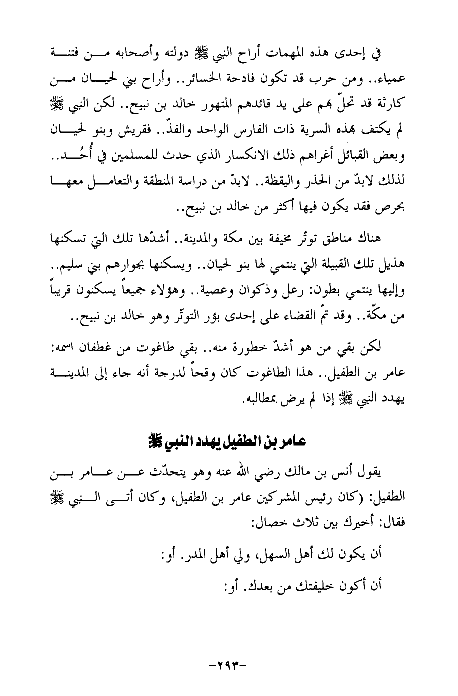 لكن بقي من هو أشدّ خطورة منه .. بقى طاغوت من غطفان اسمه: عامر بن الطفيل .. هذا الطاغوت كان وقحًا لدرجة أنه جاء إلى المدينة يهدد النبي - صلى الله عليه وسلم - إذا لم يرض بمطالبه.