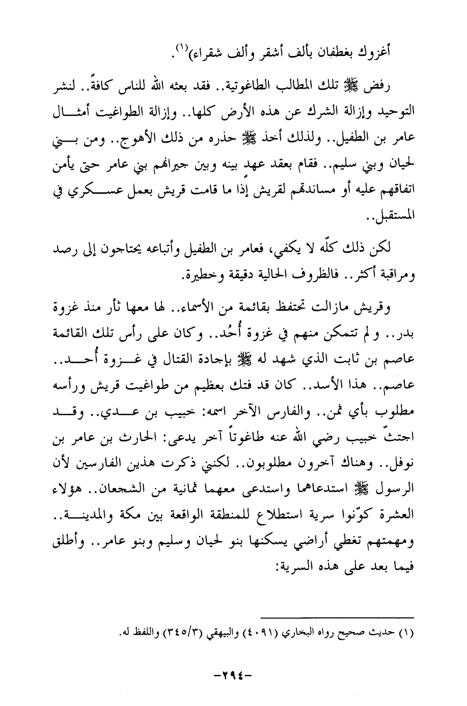 وقريش ما زالت تحتفظ بقائمة من الأسماء .. لها معها ثأر منذ غزوة بدر .. ولم تتمكن منهم في غزوة أُحُد .. وكان على رأس تلك القائمة عاصم بن ثابت الذي شهد له - صلى الله عليه وسلم - بإجادة القتال في غزوة أحد .. عاصم .. هذا الأسد .. كان قد فتك بعظيم من طواغيت قريش ورأسه مطلوب بأي ثمن .. والفارس الآخر اسمه: خبيب بن عدي .. وقد اجتثّ خبيب رضي الله عنه طاغوتًا آخر يدعى: الحارث بن عامر بن نوفل .. وهناك آخرون مطلوبون .. لكنني ذكرت هذين الفارسين لأن الرسول - صلى الله عليه وسلم - استدعاهما واستدعى معهما ثمانية من الشجعان .. هؤلاء العشرة كوّنوا سرية استطلاع للمنطقة الواقعة بين مكة والمدينة .. ومهمتهم تغطي أراضي يسكنها بنو لحيان وسليم وبنو عامر .. وأطلق فيما بعد على هذه السرية: