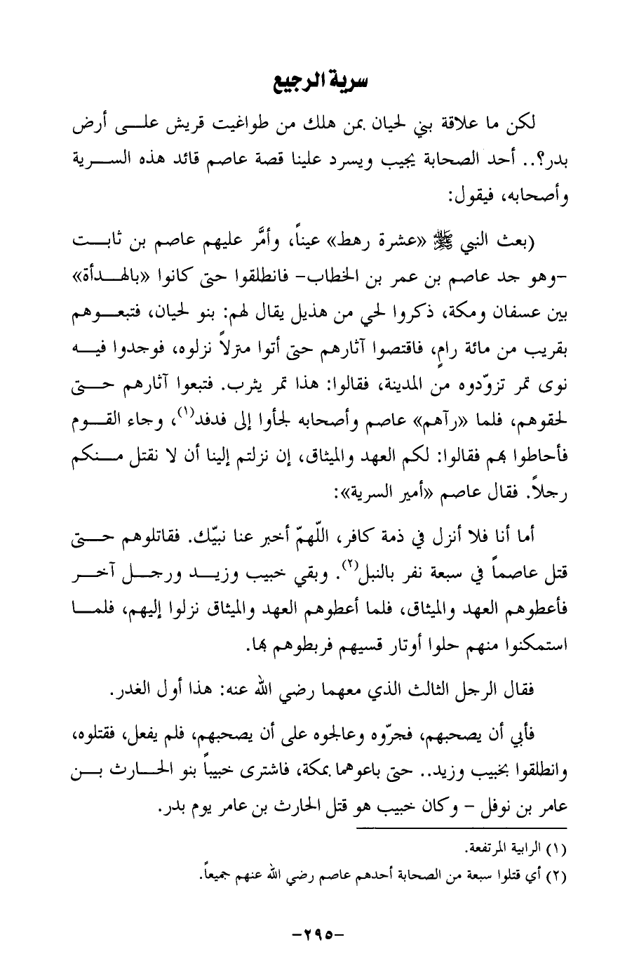 (بعث النبي - صلى الله عليه وسلم - "عشرة رهط" عينًا، وأمَّر عليهم عاصم بن ثابت -وهو جد عاصم بن عمر بن الخطاب- فانطلقوا حتى كانوا "بالهدأة" بين عسفان ومكة، ذكروا لحي من هذيل يقال لهم: بنو لحيان، فتبعوهم بقريب من مائة رامٍ، فاقتصوا آثارهم حتى أتوا منزلًا نزلوه، فوجدوا فيه نوى تمر تزوّدوه من المدينة، فقالوا: هذا تمر يثرب. فتبعوا آثارهم حتى لحقوهم، فلما "رآهم" عاصم وأصحابه لجأوا إلى فدفد (¬1)، وجاء القوم فأحاطوا بهم فقالوا: لكم العهد والميثاق، إن نزلتم إلينا أن لا نقتل منكم رجلًا. فقال عاصم "أمير السرية":