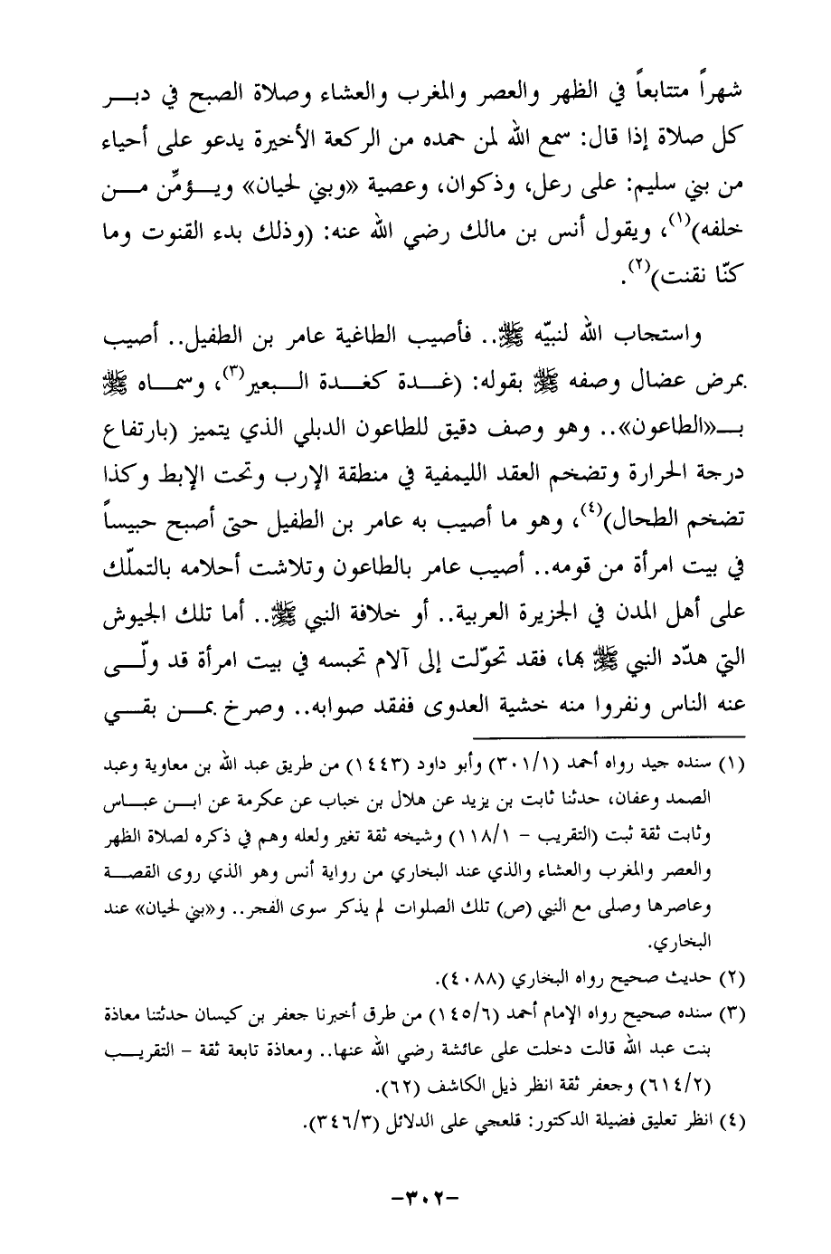 (¬1) سنده جيد رواه أحمد (1/ 301) وأبو داود (1443) من طريق عبد الله بن معاوية وعبد الصمد وعفان، حدثنا ثابت بن يزيد عن هلال بن خباب عن عكرمة عن ابن عباس وثابت ثقة ثبت (التقريب-1/ 118) وشيخه ثقة تغير ولعله وهم في ذكره لصلاة الظهر والعصر والمغرب والعشاء والذي عند البخاري من رواية أنس وهو الذي روى القصة وعاصرها وصلى مع النبي - صلى الله عليه وسلم - تلك الصلوات لم يذكر سوى الفجر .. و"بني لحيان" عند البخاري.