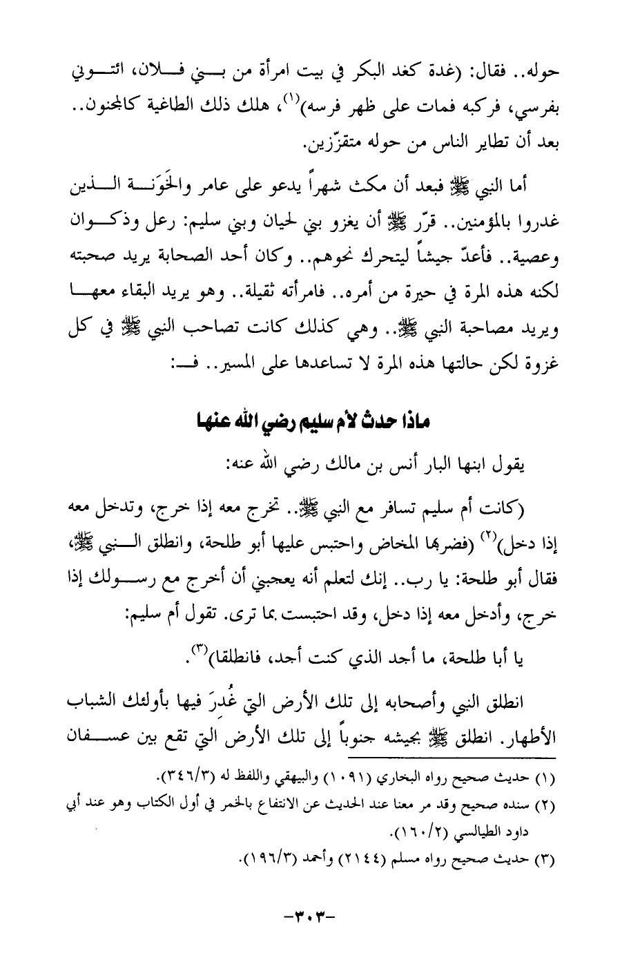 أما النبي - صلى الله عليه وسلم - فبعد أن مكث شهرًا يدعو على عامر والخَوَنة الذين غدروا بالمؤمنين .. قرّر - صلى الله عليه وسلم - أن يغزو بني لحيان وبني سليم: رعل وذكوان وعصية .. فأعدّ جيشًا ليتحرك نحوهم .. وكان أحد الصحابة يريد صحبته لكنه هذه المرة في حيرة من أمره .. فامرأته ثقيلة .. وهو يريد البقاء معها ويريد مصاحبة النبي - صلى الله عليه وسلم - .. وهي كذلك كانت تصاحب النبي - صلى الله عليه وسلم - في كل غزوة لكن حالتها هذه المرة لا تساعدها على المسير .. فـ: