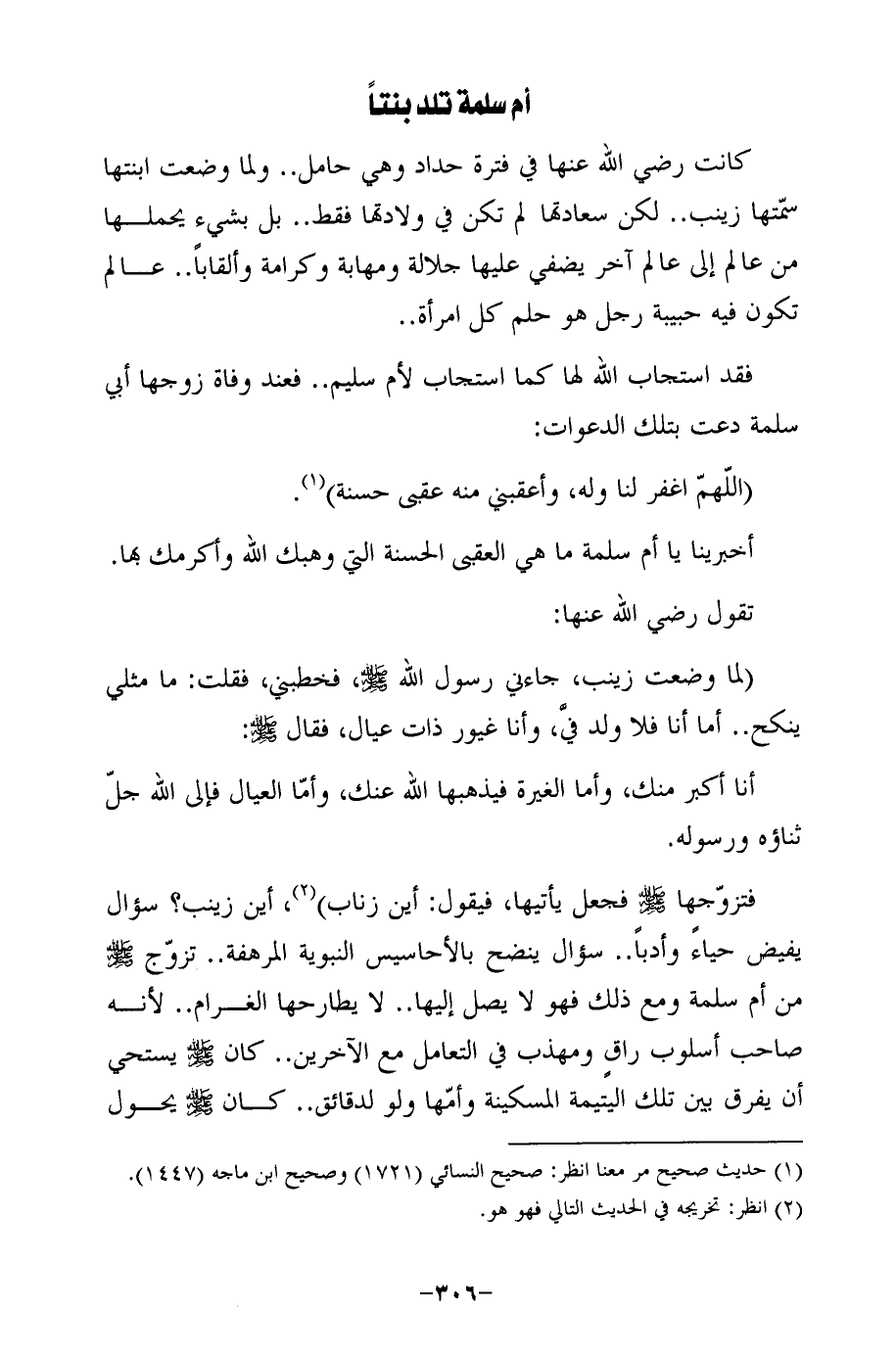 فتزوّجها - صلى الله عليه وسلم - فجعل يأتيها، فيقول؛ أين زناب) (¬2)، أين زينب؟ سؤال يفيض حياءً وأدبًا .. سؤال ينضح بالأحاسيس النبوية المرهفة .. تزوّج - صلى الله عليه وسلم - من أم سلمة ومع ذلك فهو لا يصل إليها .. لا يطارحها الغرام .. لأنه صاحب أسلوب راقٍ ومهذب في التعامل مع الآخرين .. كان - صلى الله عليه وسلم - يستحي أن يفرق بين تلك اليتيمة المسكينة وأمّها ولو لدقائق .. كان - صلى الله عليه وسلم - يحول