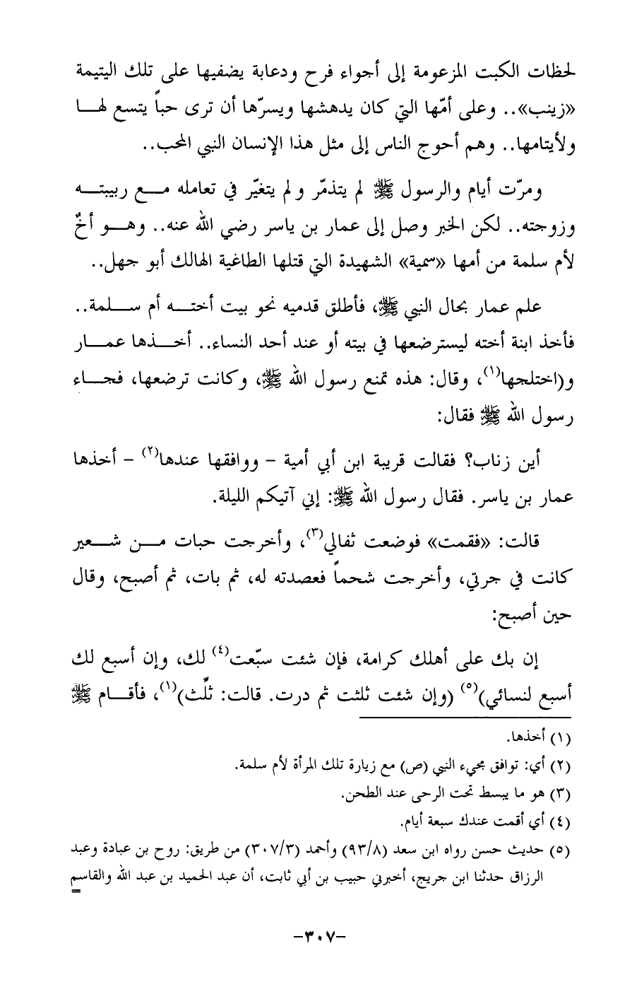 (¬5) حديثٌ حسنٌ رواه ابن سعد (8/ 93) وأحمدُ (3/ 307) من طريق: روح بن عبادة وعبد الرزاق حدثنا ابن جريج، أخبرني حبيب بن أبي ثابت، أن عبد الحميد بن عبد الله والقاسم ابن محمَّد حدثاه: أنهما سمعا أبا بكر بن عبد الرحمن يخبر أن أم سلمة أخبرته .. وأبو بكر ابن عبد الرحمن تابعي ثقة فقيه عابد -التقريب (2/ 398) وعبد الحميد بن عبد الله المخزومي بحتاج إلى توثيق لكنه متابع في هذا السند تابعه القاسم بن محمَّد المخزومي وهو مثله في الدرجة انظر: التقريب (2/ 120) والتهذيب (6/ 118) وحبيب ثقة فقيه جليل، وابن جريج لم يدلس. وللحديث شاهد بسند ضعيف عند كل من ابن سعد (8/ 90) وأحمدُ (6/ 313) والحاكم (4/ 17).
