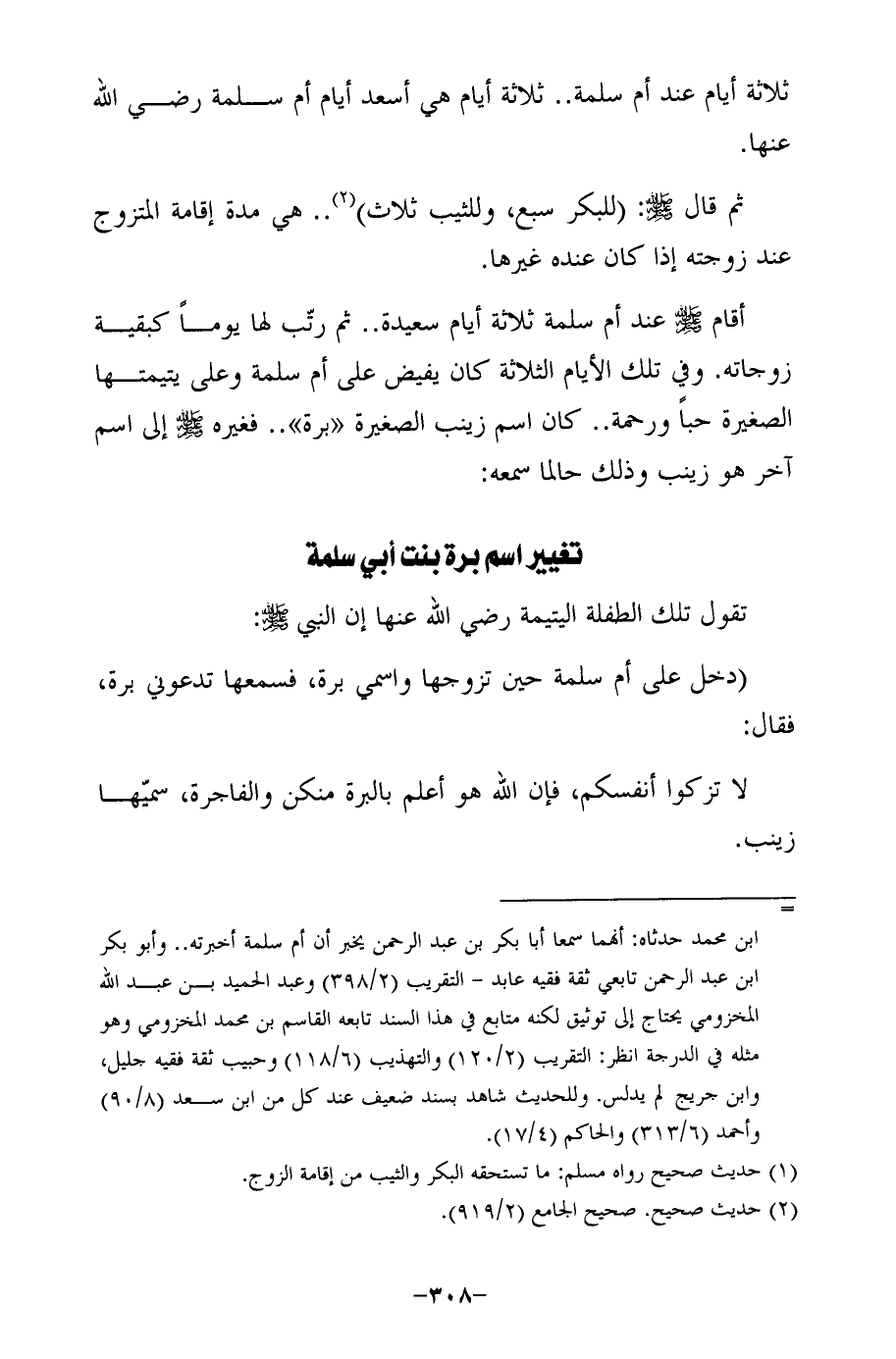 أقام - صلى الله عليه وسلم - عند أم سلمة ثلاثة أيام سعيدة .. ثم رتّب لها يومًا كبقية زوجاته. وفي تلك الأيام الثلاثة كان يفيض على أم سلمة وعلى يتيمتها الصغيرة حبًا ورحمة .. كان اسم زينب الصغيرة "برة" .. فغيره - صلى الله عليه وسلم - إلى اسم آخر هو زينب وذلك حالما سمعه: