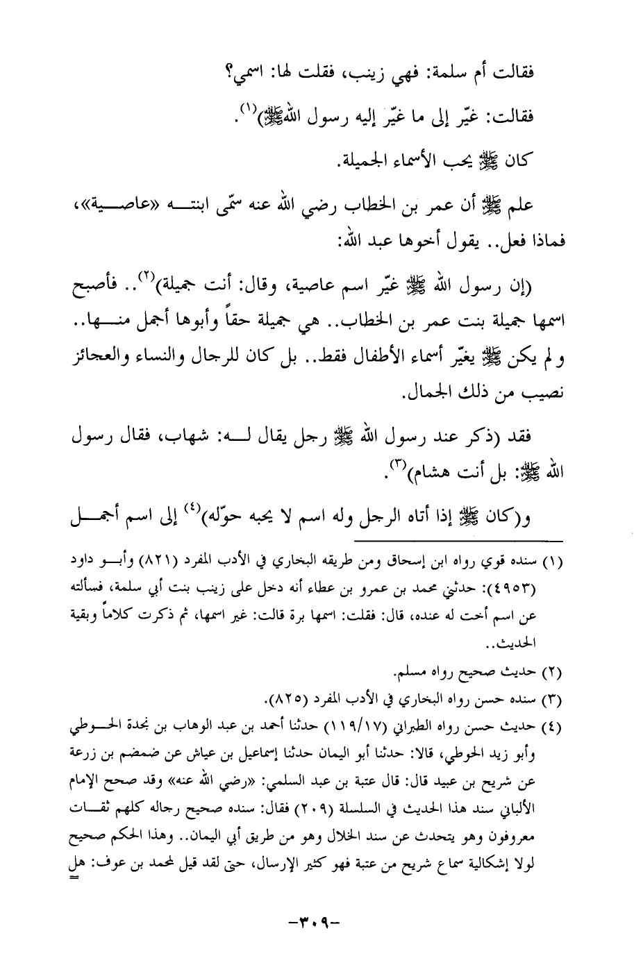 (إن رسول الله - صلى الله عليه وسلم - غيّر اسم عاصية، وقال: أنت جميلة) (¬2) .. فأصبح اسمها جميلة بنت عمر بن الخطاب .. هي جميلة حقًا وأبوها أجمل منها .. ولم يكن - صلى الله عليه وسلم - يغيّر أسماء الأطفال فقط .. بل كان للرجال والنساء والعجائز نصيب من ذلك الجمال.