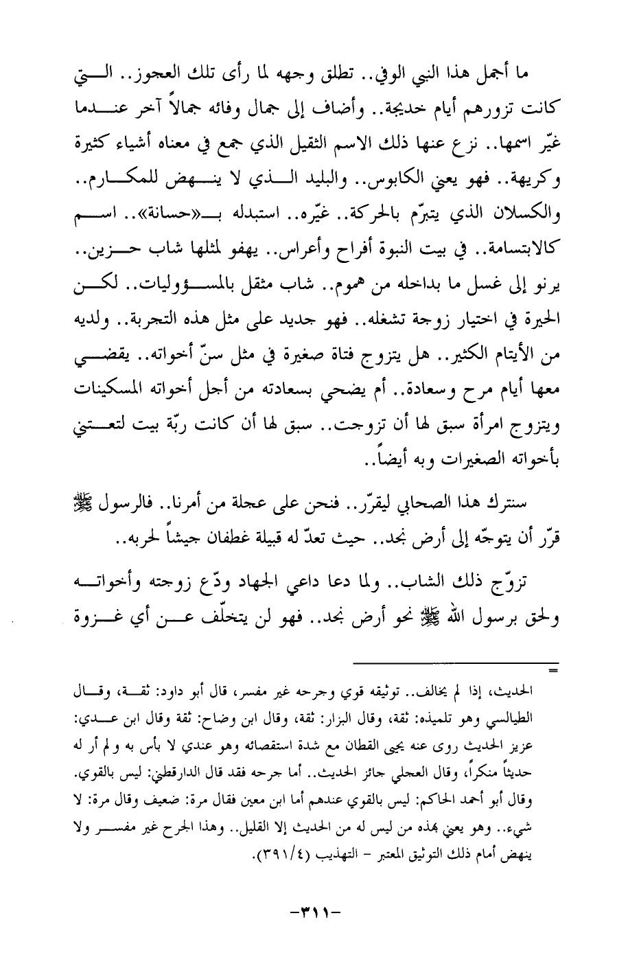 ما أجل هذا النبي الوفي .. تطلق وجهه لما رأى تلك العجوز .. التي كانت تزورهم أيام خديجة .. وأضاف إلى جمال وفائه جمالًا آخر عندما غيّر اسمها .. نزع عنها ذلك الاسم الثقيل الذي جمع في معناه أشياء كثيرة وكريهة .. فهو يعني الكابوس .. والبليد الذي لا ينهض للمكارم .. والكسلان الذي يتبرّم بالحركة .. غيّره .. استبدله بـ "حسانة" .. اسم كالابتسامة .. في بيت النبوة أفراح وأعراس .. يهفو لمثلها شاب حزين .. يرنو إلى غسل ما بداخله من هموم .. شاب مثقل بالمسؤوليات .. لكن الحيرة في اختيار زوجة تشغله .. فهو جديد على مثل هذه التجربة .. ولديه من الأيتام الكثير .. هل يتزوج فتاة صغيرة في مثل سنّ أخواته .. يقضى معها أيام مرح وسعادة .. أم يضحي بسعادته من أجل أخواته المسكينات ويتزوج امرأة سبق لها أن تزوجت .. سبق لها أن كانت ربّة بيت لتعتني بأخواته الصغيرات وبه أيضًا ..