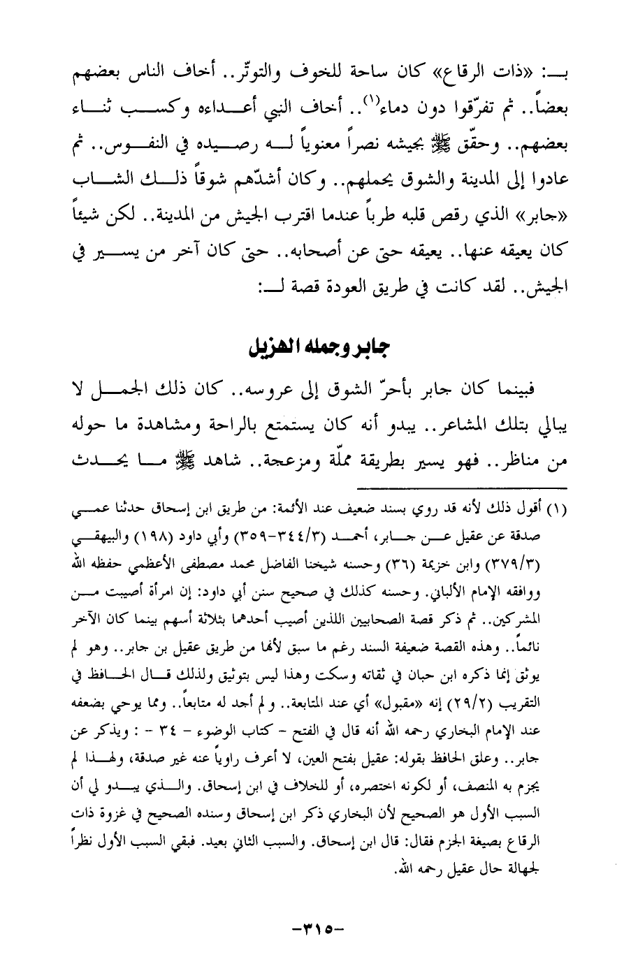 (¬1) أقول ذلك لأنه قد روي بسند ضعيف عند الأئمة: من طريق ابن إسحاق حدثنا عمي صدقة عن عقيل عن جابر، أحمد (3/ 344 - 359) وأبي داود (198) والبيهقيُّ (3/ 379) وابن خزيمة (36) وحسنه شيخنا الفاضل محمَّد مصطفى الأعظمي حفظه الله ووافقه الإمام الألباني. وحسنه كذلك في صحيح سنن أبى داود: إن امرأة أصيبت من المشركين .. ثم ذكر قصة الصحابيين اللذين أصيب أحدهما بثلاثة أسهم بينما كان الآخر نائمًا .. وهذه القصة ضعيفة السند رغم ما سبق لأنها من طريق عقيل بن جابر .. وهو لم يوثق إنما ذكره ابن حبان في ثقاته وسكت وهذا ليس بتوثيق ولذلك قال الحافظ في التقريب (2/ 29) إنه "مقبول" أي عند المتابعة .. ولم أجد له متابعًا .. ومما يوحي بضعفه عند الإمام البخاري رحمه الله أنه قال في الفتح -كتاب الوضوء- 34 - : ويذكر عن جابر .. وعلق الحافظ بقوله: عقيل بفتح العين، لا أعرف راويًا عنه غير صدقة، ولهذا لم يجزم به المنصف، أو لكونه اختصره، أو للخلاف في ابن إسحاق. والذي يبدو لي أن السبب الأول هو الصحيح لأن البخاري ذكر ابن إسحاق وسنده الصحيح في غزوة ذات الرقاع بصيغة الجزم فقال: قال ابن إسحاق. والسبب الثاني بعيد. فبقي السبب الأول نظرًا لجهالة حال عقيل رحمه الله.