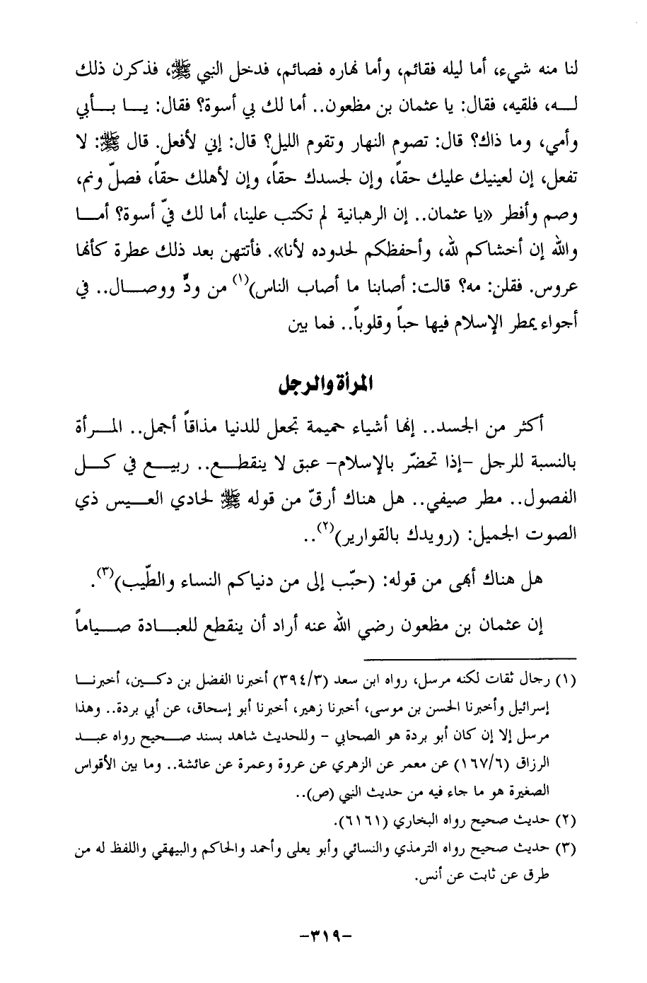 لنا منه شيء، أما ليله فقائم، وأما نهاره فصائم، فدخل النبي - صلى الله عليه وسلم -، فذكرن ذلك له، فلقيه، فقال: يا عثمان بن مظعون .. أما لك بي أسوة؟ فقال: يا بأبي وأمي، وما ذاك؟ قال: تصوم النهار وتقوم الليل؟ قال: إني لأفعل. قال - صلى الله عليه وسلم -: لا تفعل، إن لعينيك عليك حقًا، وإن لجسدك حقًا، وإن لأهلك حقًا، فصلّ ونم، وصم وأفطر "يا عثمان .. إن الرهبانية لم تكتب علينا، أما لك فيّ أسوة؟ أما والله إن أخشاكم لله، وأحفظكم لحدوده لأنا". فأتتهن بعد ذلك عطرة كأنها عروس. فقلن: مه؟ قالت: أصابنا ما أصاب الناس) (¬1) من ودٍّ ووصال .. في أجواء يمطر الإِسلام فيها حبًا وقلوبًا .. فما بين