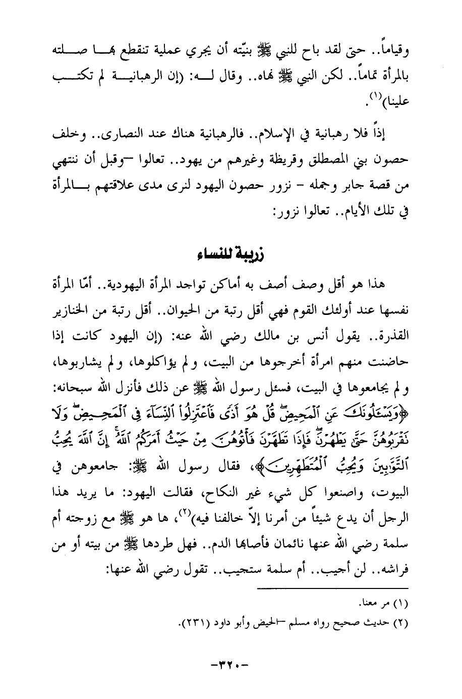 هذا هو أقل وصف أصف به أماكن تواجد المرأة اليهودية .. أمّا المرأة نفسها عند أولئك القوم فهي أقل رتبة من الحيوان .. أقل رتبة من الخنازير القذرة .. يقول أنس بن مالك رضي الله عنه: (إن اليهود كانت إذا حاضت منهم امرأة أخرجوها من البيت، ولم يؤاكلوها، ولم يشاربوها، ولم يجامعوها في البيت، فسئل رسول الله - صلى الله عليه وسلم - عن ذلك فأنزل الله سبحانه: {وَيَسْأَلُونَكَ عَنِ الْمَحِيضِ قُلْ هُوَ أَذًى فَاعْتَزِلُوا النِّسَاءَ فِي الْمَحِيضِ وَلَا تَقْرَبُوهُنَّ حَتَّى يَطْهُرْنَ فَإِذَا تَطَهَّرْنَ فَأْتُوهُنَّ مِنْ حَيْثُ أَمَرَكُمُ اللَّهُ إِنَّ اللَّهَ يُحِبُّ التَّوَّابِينَ وَيُحِبُّ الْمُتَطَهِّرِينَ}، فقال رسول الله - صلى الله عليه وسلم -: جامعوهن في البيوت، واصنعوا كل شيء غير النكاح، فقالت اليهود: ما يريد هذا الرجل أن يدع شيئًا من أمرنا إلَّا خالفنا فيه) (¬2)، ها هو - صلى الله عليه وسلم - مع زوجته أم سلمة رضي الله عنها نائمان فأصابها الدم .. فهل طردها - صلى الله عليه وسلم - من بيته أو من فراشه .. لن أجيب .. أم سلمة ستجيب .. تقول رضي الله عنها: