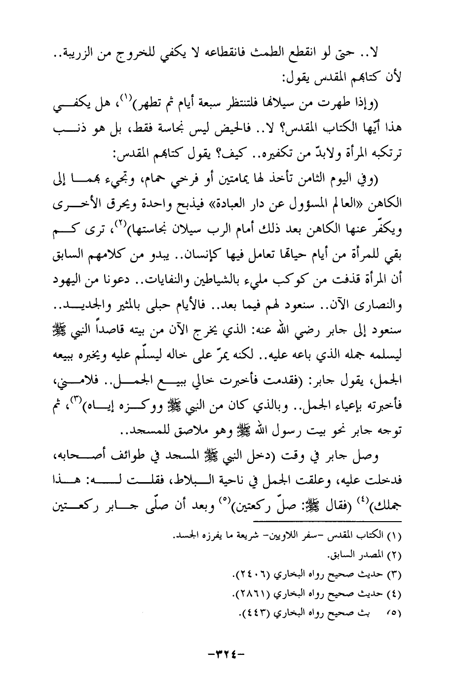(وفي اليوم الثامن تأخذ لها يمامتين أو فرخي حمام، وتجيء بهما إلى الكاهن "العالم المسؤول عن دار العبادة" فيذبح واحدة ويحرق الأخرى ويكفّر عنها الكاهن بعد ذلك أمام الرب سيلان نجاستها) (¬2)، ترى كم بقي للمرأة من أيام حياتها تعامل فيها كإنسان .. يبدو من كلامهم السابق أن المرأة قذفت من كوكب مليء بالشياطن والنفايات .. دعونا من اليهود والنصارى الآن .. سنعود لهم فيما بعد .. فالأيام حبلى بالمثير والجديد .. سنعود إلى جابر رضي الله عنه: الذي يخرج الآن من بيته قاصدًا النبي - صلى الله عليه وسلم - ليسلمه جمله الذي باعه عليه .. لكنه يمرّ على خاله ليسلّم عليه ويخبره ببيعه الجمل، يقول جابر: (فقدمت فأخبرت خالي ببيع الجمل .. فلامني، فأخبرته بإعياء الجمل .. وبالذي كان من النبي - صلى الله عليه وسلم -ووكزه إياه) (¬3)، ثم توجه جابر نحو بيت رسول الله - صلى الله عليه وسلم - وهو ملاصق للمسجد ..