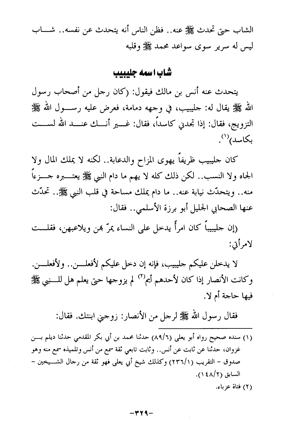 يتحدث عنه أنس بن مالك فيقول: (كان رجل من أصحاب رسول الله - صلى الله عليه وسلم - يقال له: جليبيب، في وجهه دمامة، فعرض عليه رسول الله - صلى الله عليه وسلم - التزويج، فقال: إذا تجدني كاسدًا، فقال: غير أنك عند الله لست بكاسد) (¬1).