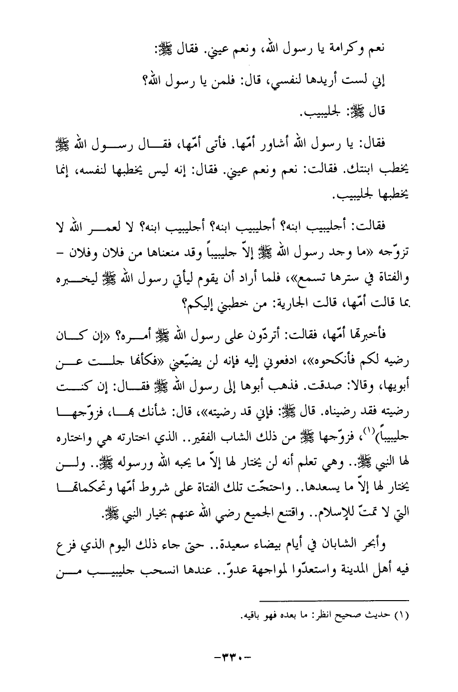 فقال: يا رسول الله أشاور أمّها. فأتى أمّها، فقال رسول الله -صلى الله عليه وسلم - يخطب ابنتك. فقالت: نعم ونعم عيني. فقال: إنه ليس يخطبها لنفسه، إنما يخطبها لجليبيب.