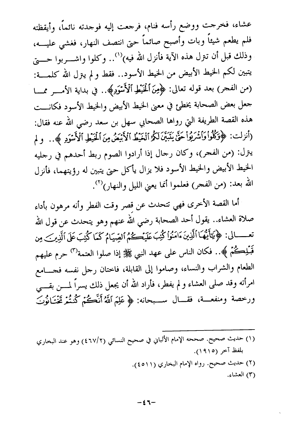 أما القصة الأخرى فهي تتحدث عن قِصر وقت الفطر وأنه مرهون بأداء صلاة العشاء .. يقول أحد الصحابة رضى الله عنهم وهو يتحدث عن قول الله تعالى: {يَا أَيُّهَا الَّذِينَ آمَنُوا كُتِبَ عَلَيْكُمُ الصِّيَامُ كَمَا كُتِبَ عَلَى الَّذِينَ مِنْ قَبْلِكُمْ} .. فكان الناس على عهد النبي -صلى الله عليه وسلم- إذا صلوا العتمة (¬3) حرم عليهم الطعام والشراب والنساء, وصاموا إلى القابلة، فاختان رجل نفسه فجامع امرأته وقد صلى العشاء ولم يفطر، فأراد الله أن يجعل ذلك يسرًا لمن بقي ورخصة ومنفعة، فقال سبحانه: {عَلِمَ اللَّهُ أَنَّكُمْ كُنْتُمْ تَخْتَانُونَ