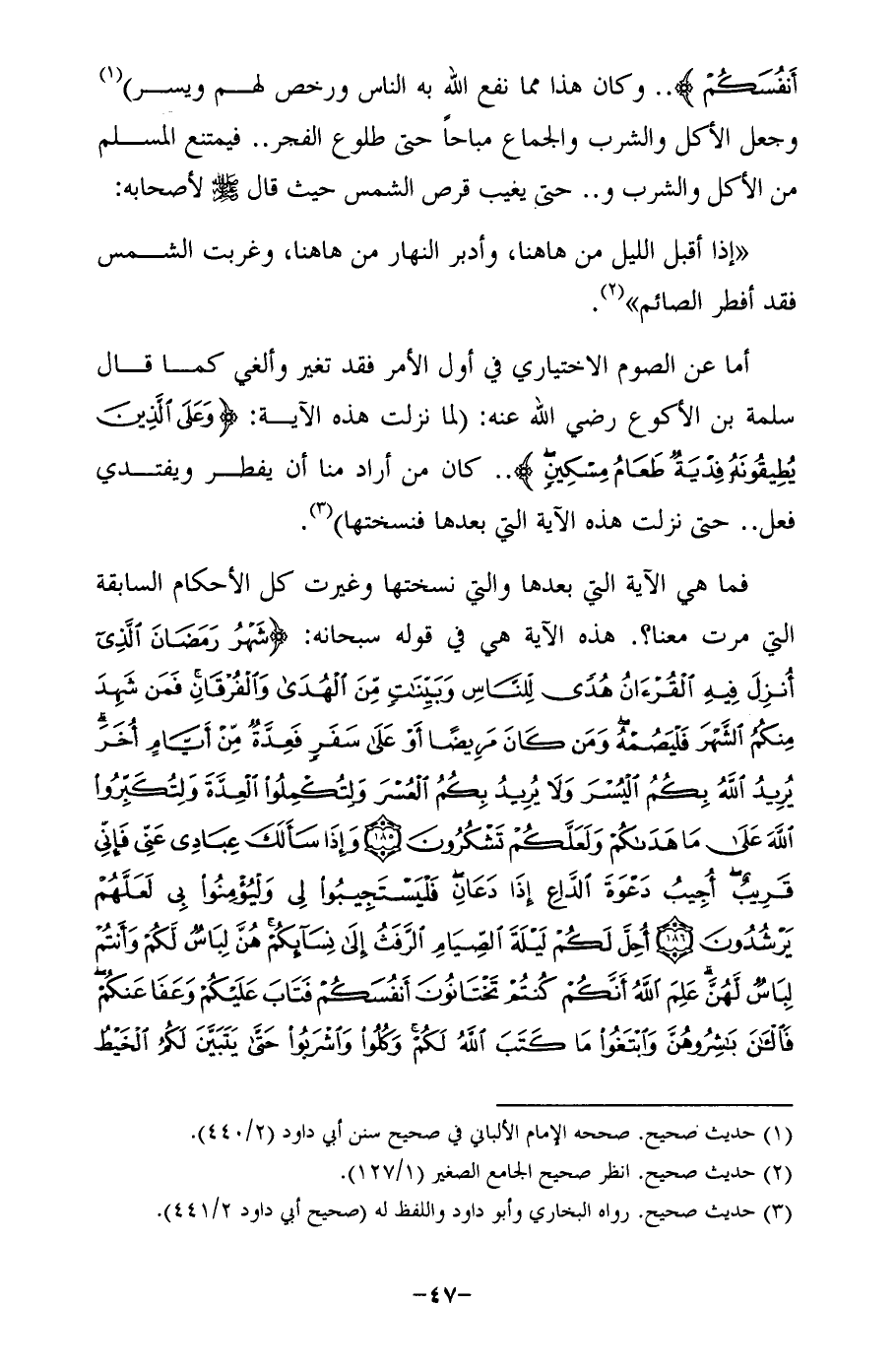 ْأَنْفُسَكُمْ} .. وكان هذا مما نفع الله به الناس ورخص لهم ويسر) (¬1) وجعل الأكل والشرب والجماع مباحًا حتى طلوع الفجر .. فيمتنع المسلم من الأكل والشرب و .. حتي يغيب قرص الشمس حيث قال -صلى الله عليه وسلم- لأصحابه: