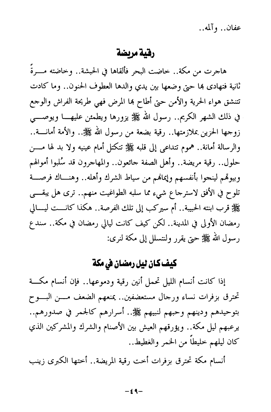هاجرت من مكة .. خاضت البحر فألقاها في الحبشة .. وخاضته مرةً ثانية فتهادى بها حتى وضعها بين يدي والدها العطوف الحنون .. وما كادت تتنشق هواء الحرية والأمن حتى أطاح بها المرض فهي طريحة الفراش والوجع في ذلك الشهر الكريم .. رسول الله -صلى الله عليه وسلم- يزورها ويطمئن عليها ويوصى زوجها الحزين بملازمتها .. رقية بضعة من رسول الله -صلى الله عليه وسلم- .. والأمة أمانة .. والرسالة أمانة .. هموم تتداعى إلى قلبه -صلى الله عليه وسلم- تتكتل أمام عينيه ولا بد لها من حلول .. رقية مريضة .. وأهل الصفة جائعون .. والمهاجرون قد سُلبوا أموالهم وبيوتهم لينجوا بأنفسهم وإيمانهم من سياط الشرك وأهله .. وهناك فرصة تلوح في الأفق لاسترجاع شيء مما سلبه الطواغيت منهم .. ترى هل يبقى -صلى الله عليه وسلم- قرب ابنته الحبيبة .. أم سيركب إلى تلك الفرصة .. هكذا كانت ليالي رمضان الأولى في المدينة .. لكن كيف كانت ليالي رمضان في مكة .. سندع رسول الله -صلى الله عليه وسلم- حتى يقرر ولنتسلل إلى مكة لنرى: