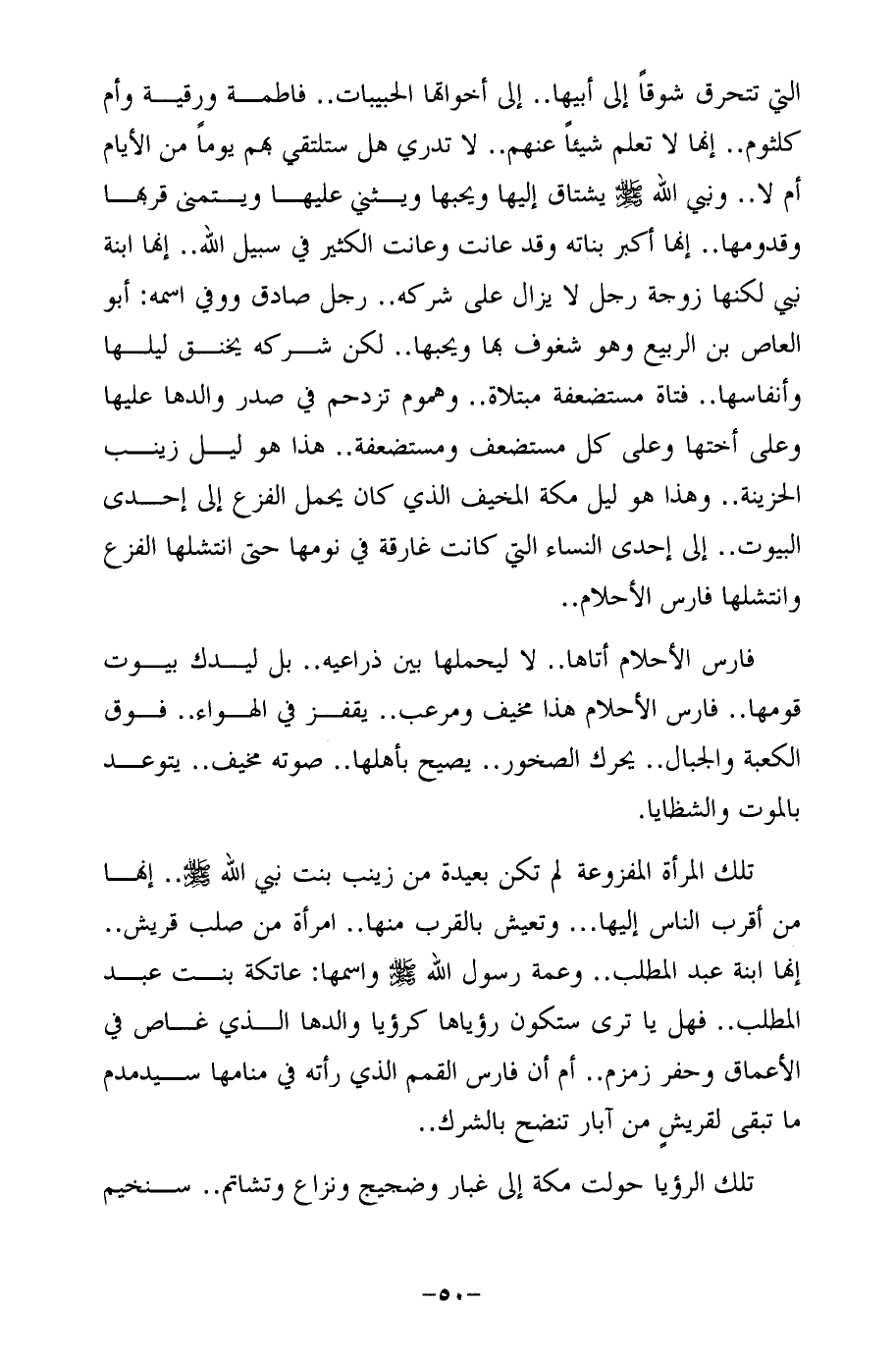 التي تتحرق شوقًا إلى أبيها .. إلى أخواتها الحبيبات .. فاطمة ورقية وأم كلثوم .. إنها لا تعلم شيئًا عنهم .. لا تدري هل ستلتقى بهم يومًا من الأيام أم لا .. ونبي الله -صلى الله عليه وسلم- يشتاق إليها ويحبها ويثني عليها ويتمنى قربها وقدومها .. إنها أكبر بناته وقد عانت وعانت الكثير في سبيل الله .. إنها ابنة نبي لكنها زوجة رجل لا يزال على شركه .. رجل صادق ووفي اسمه: أبو العاص بن الربيع وهو شغوف بها ويحبها .. لكن شركه يخنق ليلها وأنفاسها .. فتاة مستضعفة مبتلاة .. وهموم تزدحم في صدر والدها عليها وعلى أختها وعلى كل مستضعف ومستضعفة .. هذا هو ليل زينب الحزينة .. وهذا هو ليل مكة المخيف الذي كان يحمل الفزع إلى إحدى البيوت .. إلى إحدى النساء التي كانت غارقة في نومها حتى انتشلها الفزع وانتشلها فارس الأحلام ..