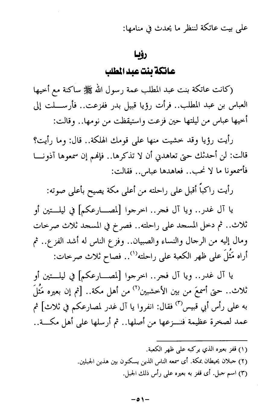 (كانت عاتكة بنت عبد المطلب عمة رسول الله -صلى الله عليه وسلم- ساكنة مع أخيها العباس بن عبد المطلب .. فرأت رؤيا قبيل بدر ففزعت .. فأرسلت إلى أخيها عباس من ليلتها حين فزعت واستيقظت من نومها .. وقالت: