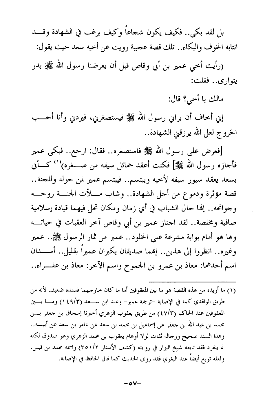 (¬1) ما أريده من هذه القصة هو ما بين المعقوفين أما ما كان خارجهما فسنده ضعيف لأنه من طريق الواقدي كما في الإصابة -ترجمة عمير- وعند ابن سعد (3/ 149) وما بين المعقوفين عند الحاكم (3/ 47) من طريق يعقوب الزهريّ أخبرنا إسحاق بن جعفر بن محمَّد بن عبد الله بن جعفر عن إسماعيل بن محمَّد بن سعد عن عامر بن سعد عن أبيه .. وهذا السند صحيح ورجاله ثقات لولا أوهام يعقوب بن محمَّد الزهريّ وهو صدوق لكنه لم ينفرد فقد تابعه شيخ البزار في روايته (كشف الأستار 2/ 351) واسمه محمَّد بن قيس. ولعله توبع أيضًا عند البغوي فقد روى الحديث كما قال الحافظ في الإصابة.